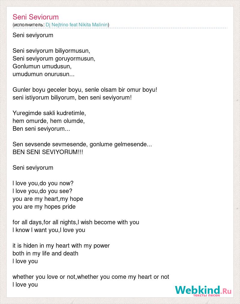 Seni seviyorum Seni seviyorum biliyormusun, Seni seviyorum goruyormusun, Gonlumun umudusun, umudumun onurusun... Gunler boyu geceler boyu, senle olsam bir omur boyu! seni istiyorum biliyorum, ben seni seviyorum! Yuregimde sakli kudretimle, hem omurde, hem olumde, Ben seni seviyorum... Sen sevsende sevmesende, gonlume gelmesende... BEN SENI SEVIYORUM!!! Seni seviyorum l love you,do you now? l love you,do you see? you are my heart,my hope you are my hopes pride for all days,for all nights,l wish become with you l know l want you,l love you it is hiden in my heart with my power both in my life and death l love you whether you love or not,whether you come my heart or not l love you