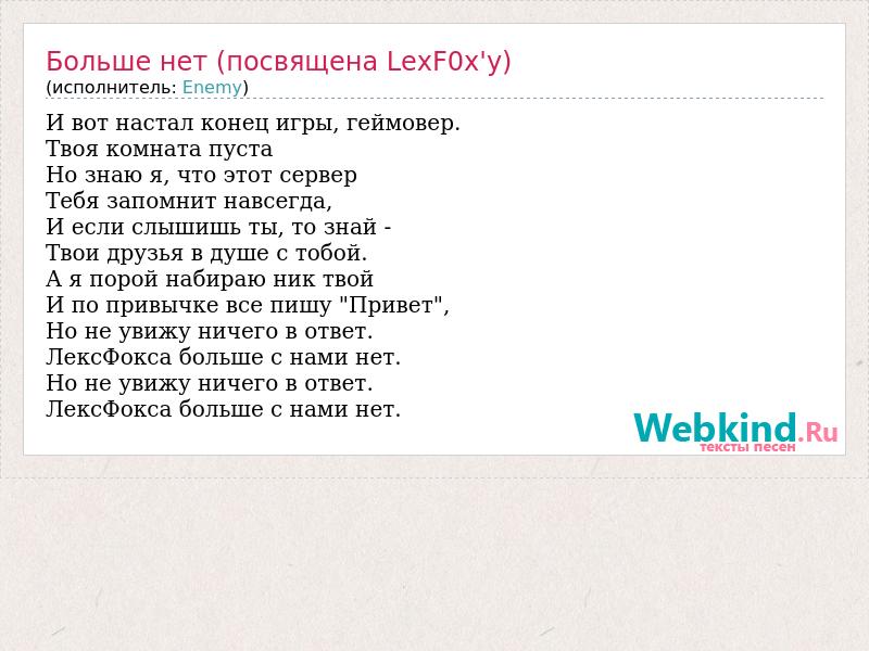 И вот настал конец игры, геймовер. Твоя комната пуста Но знаю я, что этот сервер Тебя запомнит навсегда, И если слышишь ты, то знай - Твои друзья в душе с тобой. А я порой набираю ник твой И по привычке все пишу "Привет", Но не увижу ничего в ответ. ЛексФокса больше с нами нет. Но не увижу ничего в ответ. ЛексФокса больше с нами нет.