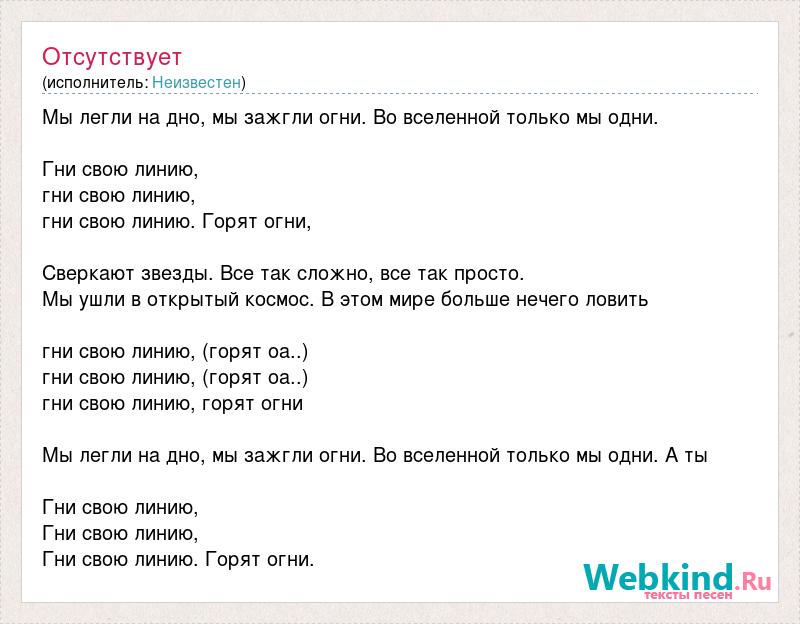 Мы легли на дно, мы зажгли огни. Во вселенной только мы одни. Гни свою линию, гни свою линию, гни свою линию. Горят огни, Сверкают звезды. Все так сложно, все так просто. Мы ушли в открытый космос. В этом мире больше нечего ловить гни свою линию, (горят оа..) гни свою линию, (горят оа..) гни свою линию, горят огни Мы легли на дно, мы зажгли огни. Во вселенной только мы одни. А ты Гни свою линию, Гни свою линию, Гни свою линию. Горят огни.