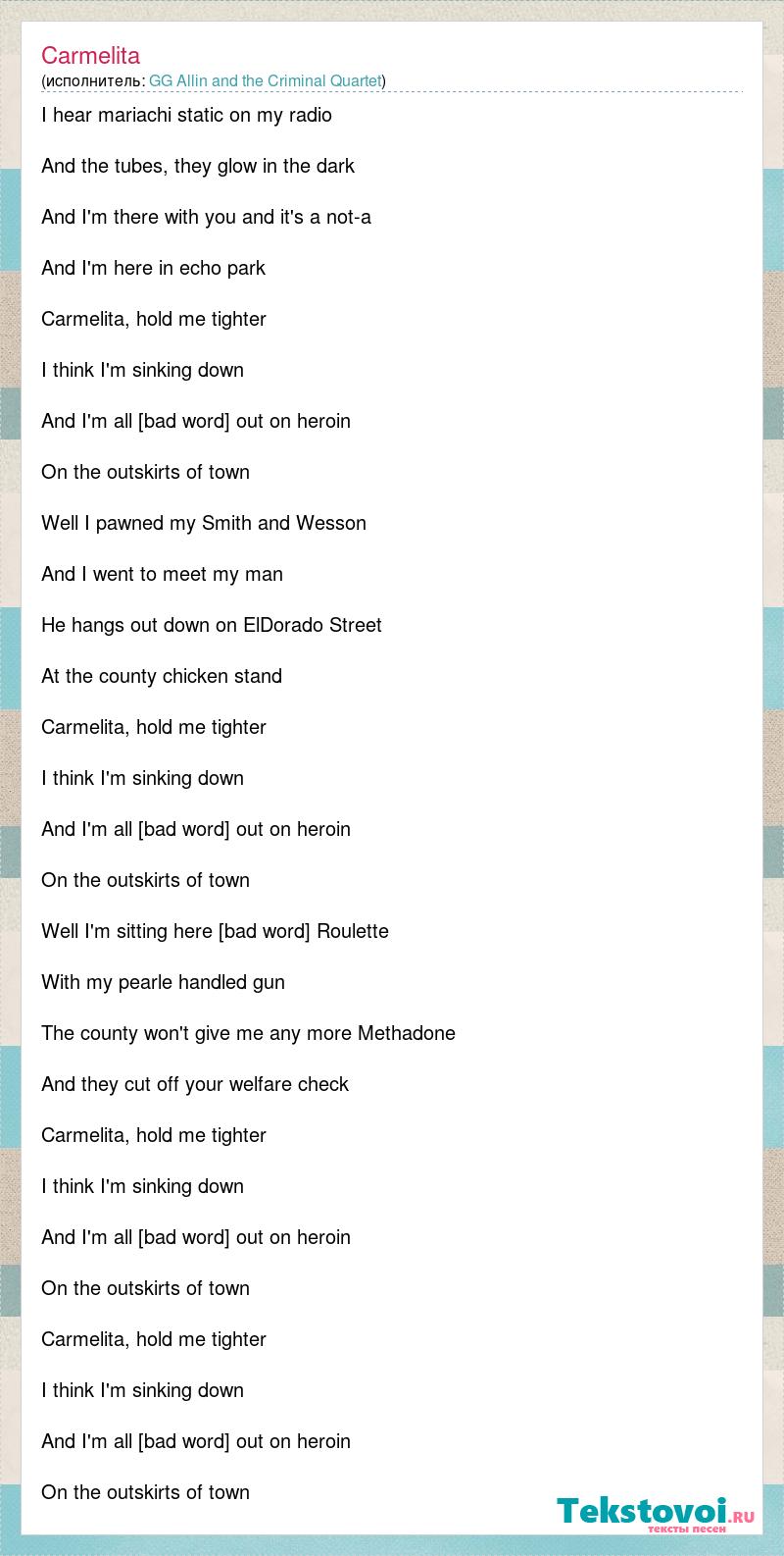 I hear mariachi static on my radio And the tubes, they glow in the dark And I'm there with you and it's a not-a And I'm here in echo park Carmelita, hold me tighter I think I'm sinking down And I'm all [bad word] out on heroin On the outskirts of town Well I pawned my Smith and Wesson And I went to meet my man He hangs out down on ElDorado Street At the county chicken stand Carmelita, hold me tighter I think I'm sinking down And I'm all [bad word] out on heroin On the outskirts of town Well I'm sitting here [bad word] Roulette With my pearle handled gun The county won't give me any more Methadone And they cut off your welfare check Carmelita, hold me tighter I think I'm sinking down And I'm all [bad word] out on heroin On the outskirts of town Carmelita, hold me tighter I think I'm sinking down And I'm all [bad word] out on heroin On the outskirts of town