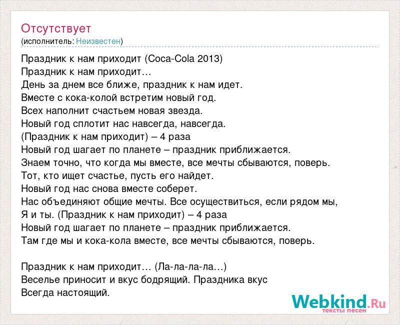 Праздник к нам приходит (Coca-Cola 2013) Праздник к нам приходит… День за днем все ближе, праздник к нам идет. Вместе с кока-колой встретим новый год. Всех наполнит счастьем новая звезда. Новый год сплотит нас навсегда, навсегда. (Праздник к нам приходит) – 4 раза Новый год шагает по планете – праздник приближается. Знаем точно, что когда мы вместе, все мечты сбываются, поверь. Тот, кто ищет счастье, пусть его найдет. Новый год нас снова вместе соберет. Нас объединяют общие мечты. Все осуществиться, если рядом мы, Я и ты. (Праздник к нам приходит) – 4 раза Новый год шагает по планете – праздник приближается. Там где мы и кока-кола вместе, все мечты сбываются, поверь. Праздник к нам приходит… (Ла-ла-ла-ла…) Веселье приносит и вкус бодрящий. Праздника вкус Всегда настоящий.