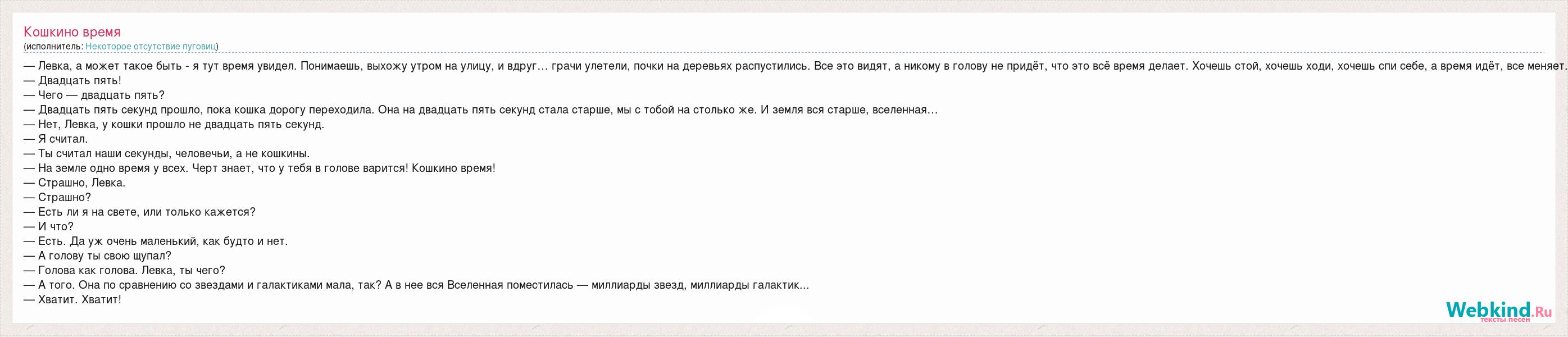 — Левка, а может такое быть - я тут время увидел. Понимаешь, выхожу утром на улицу, и вдруг… грачи улетели, почки на деревьях распустились. Все это видят, а никому в голову не придёт, что это всё время делает. Хочешь стой, хочешь ходи, хочешь спи себе, а время идёт, все меняет. — Двадцать пять! — Чего — двадцать пять? — Двадцать пять секунд прошло, пока кошка дорогу переходила. Она на двадцать пять секунд стала старше, мы с тобой на столько же. И земля вся старше, вселенная… — Нет, Левка, у кошки прошло не двадцать пять секунд. — Я считал. — Ты считал наши секунды, человечьи, а не кошкины. — На земле одно время у всех. Черт знает, что у тебя в голове варится! Кошкино время! — Страшно, Левка. — Страшно? — Есть ли я на свете, или только кажется? — И что? — Есть. Да уж очень маленький, как будто и нет. — А голову ты свою щупал? — Голова как голова. Левка, ты чего? — А того. Она по сравнению со звездами и галактиками мала, так? А в нее вся Вселенная поместилась — миллиарды звезд, миллиарды галактик... — Хватит. Хватит!