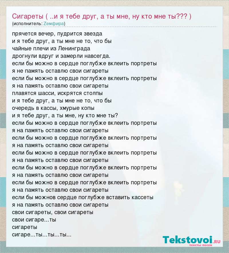 прячется вечер, пудрится звезда и я тебе друг, а ты мне не то, что бы чайные плечи из Ленинграда дрогнули вдруг и замерли навсегда. если бы можно в сердце поглубже вклеить портреты я не память оставлю свои сигареты если бы можно в сердце поглубже вклеить портреты я на память оставлю свои сигареты плавятся шасси, искрятся столпы и я тебе друг, а ты мне не то, что бы очередь в кассы, хмурые копы и я тебе друг, а ты мне, ну кто мне ты? если бы можно в сердце поглубже вклеить портреты я на память оставлю свои сигареты если бы можно в сердце поглубже вклеить портреты я на память оставлю свои сигареты если бы можно в сердце поглубже вклеить портреты я на память оставлю свои сигареты если бы можно в сердце поглубже вклеить портреты я на память оставлю свои сигареты если бы можно в сердце поглубже вклеить портреты я на память оставлю свои сигареты если бы можнов сердце поглубже вставить кассеты я на память оставлю свои сигареты свои сигареты, свои сигареты свои сигаре...ты сигареты сигаре...ты...ты...ты...