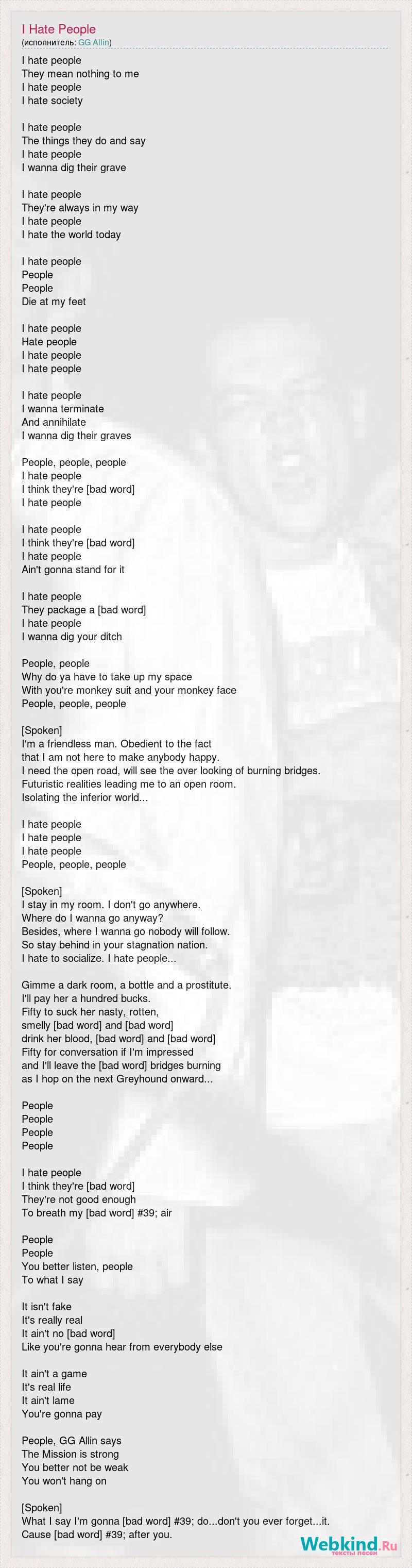 I hate people They mean nothing to me I hate people I hate society I hate people The things they do and say I hate people I wanna dig their grave I hate people They're always in my way I hate people I hate the world today I hate people People People Die at my feet I hate people Hate people I hate people I hate people I hate people I wanna terminate And annihilate I wanna dig their graves People, people, people I hate people I think they're [bad word] I hate people I hate people I think they're [bad word] I hate people Ain't gonna stand for it I hate people They package a [bad word] I hate people I wanna dig your ditch People, people Why do ya have to take up my space With you're monkey suit and your monkey face People, people, people [Spoken] I'm a friendless man. Obedient to the fact that I am not here to make anybody happy. I need the open road, will see the over looking of burning bridges. Futuristic realities leading me to an open room. Isolating the inferior world... I hate people I hate people I hate people People, people, people [Spoken] I stay in my room. I don't go anywhere. Where do I wanna go anyway? Besides, where I wanna go nobody will follow. So stay behind in your stagnation nation. I hate to socialize. I hate people... Gimme a dark room, a bottle and a prostitute. I'll pay her a hundred bucks. Fifty to suck her nasty, rotten, smelly [bad word] and [bad word] drink her blood, [bad word] and [bad word] Fifty for conversation if I'm impressed and I'll leave the [bad word] bridges burning as I hop on the next Greyhound onward... People People People People I hate people I think they're [bad word] They're not good enough To breath my [bad word] #39; air People People You better listen, people To what I say It isn't fake It's really real It ain't no [bad word] Like you're gonna hear from everybody else It ain't a game It's real life It ain't lame You're gonna pay People, GG Allin says The Mission is strong You better not be weak You won't hang on [Spoken] What I say I'm gonna [bad word] #39; do...don't you ever forget...it. Cause [bad word] #39; after you.