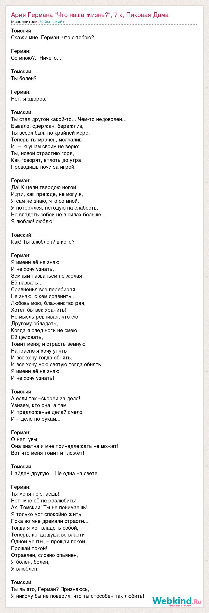 Томский: Скажи мне, Герман, что с тобою? Герман: Со мною?.. Ничего... Томский: Ты болен? Герман: Нет, я здоров. Томский: Ты стал другой какой-то... Чем-то недоволен... Бывало: сдержан, бережлив, Ты весел был, по крайней мере; Теперь ты мрачен, молчалив И, – я ушам своим не верю: Ты, новой страстию горя, Как говорят, вплоть до утра Проводишь ночи за игрой. Герман: Да! К цели твердою ногой Идти, как прежде, не могу я, Я сам не знаю, что со мной, Я потерялся, негодую на слабость, Но владеть собой не в силах больше... Я люблю! люблю! Томский: Как! Ты влюблен? в кого? Герман: Я имени её не знаю И не хочу узнать, Земным названьем не желая Её назвать... Сравненья все перебирая, Не знаю, с кем сравнить... Любовь мою, блаженство рая, Хотел бы век хранить! Но мысль ревнивая, что ею Другому обладать, Когда я след ноги не смею Ей целовать, Томит меня; и страсть земную Напрасно я хочу унять И все хочу тогда обнять, И все хочу мою святую тогда обнять... Я имени её не знаю И не хочу узнать! Томский: А если так –скорей за дело! Узнаем, кто она, а там И предложенье делай смело, И – дело по рукам... Герман: О нет, увы! Она знатна и мне принадлежать не может! Вот что меня томит и гложет! Томский: Найдем другую... Не одна на свете... Герман: Ты меня не знаешь! Нет, мне её не разлюбить! Ах, Томский! Ты не понимаешь! Я только мог спокойно жить, Пока во мне дремали страсти... Тогда я мог владеть собой, Теперь, когда душа во власти Одной мечты, – прощай покой, Прощай покой! Отравлен, словно опьянен, Я болен, болен, Я влюблен! Томский: Ты ль это, Герман? Признаюсь, Я никому бы не поверил, что ты способен так любить!