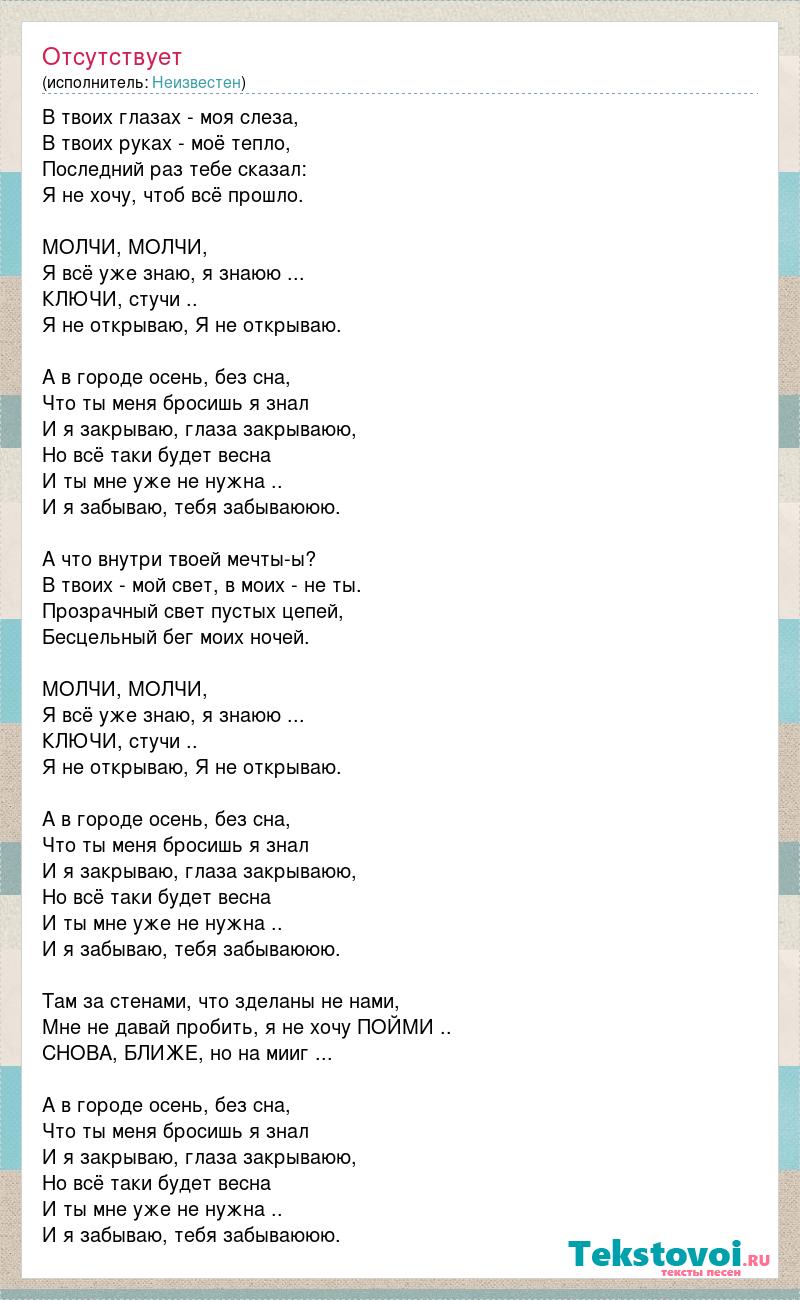 В твоих глазах - моя слеза, В твоих руках - моё тепло, Последний раз тебе сказал: Я не хочу, чтоб всё прошло. МОЛЧИ, МОЛЧИ, Я всё уже знаю, я знаюю ... КЛЮЧИ, стучи .. Я не открываю, Я не открываю. А в городе осень, без сна, Что ты меня бросишь я знал И я закрываю, глаза закрываюю, Но всё таки будет весна И ты мне уже не нужна .. И я забываю, тебя забываююю. А что внутри твоей мечты-ы? В твоих - мой свет, в моих - не ты. Прозрачный свет пустых цепей, Бесцельный бег моих ночей. МОЛЧИ, МОЛЧИ, Я всё уже знаю, я знаюю ... КЛЮЧИ, стучи .. Я не открываю, Я не открываю. А в городе осень, без сна, Что ты меня бросишь я знал И я закрываю, глаза закрываюю, Но всё таки будет весна И ты мне уже не нужна .. И я забываю, тебя забываююю. Там за стенами, что зделаны не нами, Мне не давай пробить, я не хочу ПОЙМИ .. СНОВА, БЛИЖЕ, но на мииг ... А в городе осень, без сна, Что ты меня бросишь я знал И я закрываю, глаза закрываюю, Но всё таки будет весна И ты мне уже не нужна .. И я забываю, тебя забываююю.