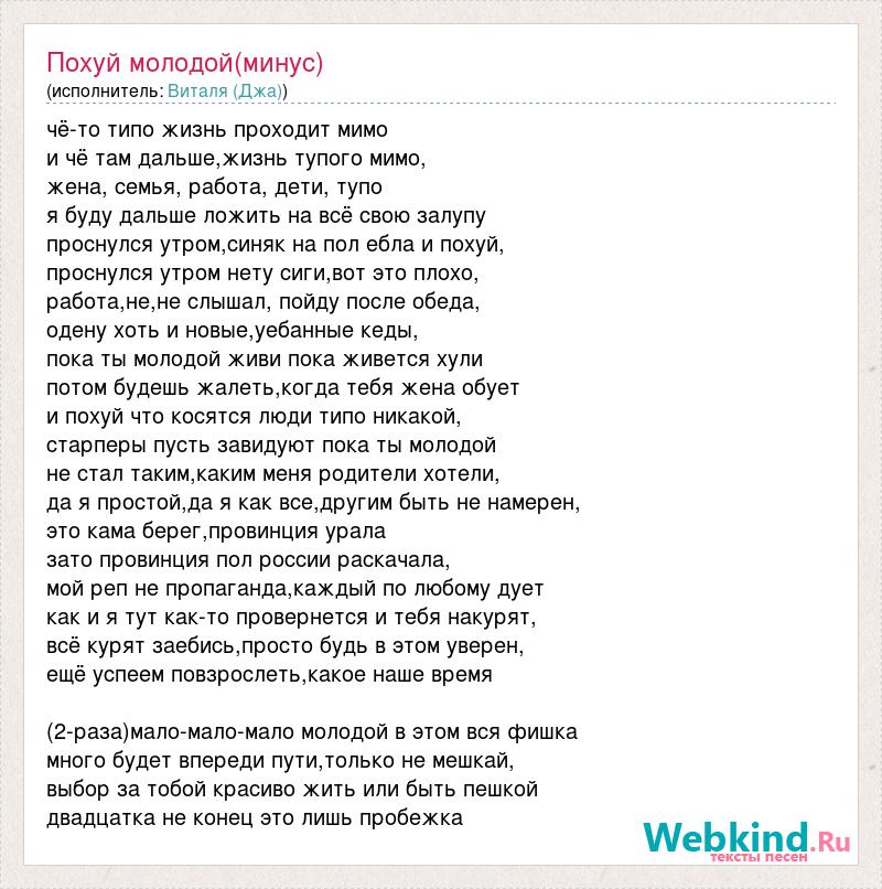 чё-то типо жизнь проходит мимо и чё там дальше,жизнь тупого мимо, жена, семья, работа, дети, тупо я буду дальше ложить на всё свою залупу проснулся утром,синяк на пол ебла и похуй, проснулся утром нету сиги,вот это плохо, работа,не,не слышал, пойду после обеда, одену хоть и новые,уебанные кеды, пока ты молодой живи пока живется хули потом будешь жалеть,когда тебя жена обует и похуй что косятся люди типо никакой, старперы пусть завидуют пока ты молодой не стал таким,каким меня родители хотели, да я простой,да я как все,другим быть не намерен, это кама берег,провинция урала зато провинция пол россии раскачала, мой реп не пропаганда,каждый по любому дует как и я тут как-то провернется и тебя накурят, всё курят заебись,просто будь в этом уверен, ещё успеем повзрослеть,какое наше время (2-раза)мало-мало-мало молодой в этом вся фишка много будет впереди пути,только не мешкай, выбор за тобой красиво жить или быть пешкой двадцатка не конец это лишь пробежка
