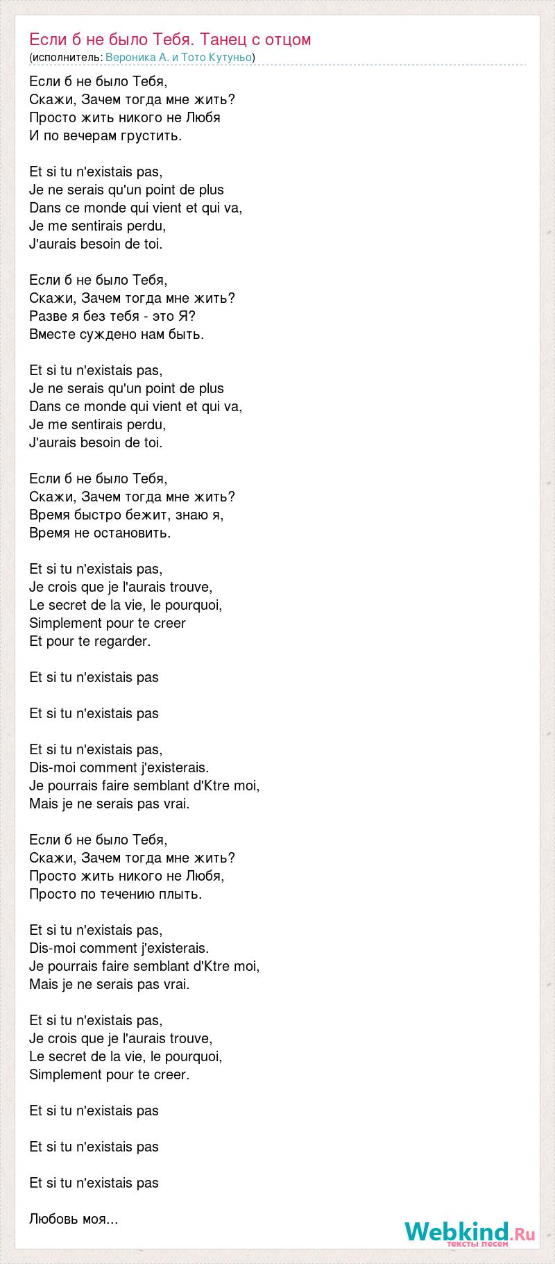 Если б не было Тебя, Скажи, Зачем тогда мне жить? Просто жить никого не Любя И по вечерам грустить. Et si tu n'existais pas, Je ne serais qu'un point de plus Dans ce monde qui vient et qui va, Je me sentirais perdu, J'aurais besoin de toi. Если б не было Тебя, Скажи, Зачем тогда мне жить? Разве я без тебя - это Я? Вместе суждено нам быть. Et si tu n'existais pas, Je ne serais qu'un point de plus Dans ce monde qui vient et qui va, Je me sentirais perdu, J'aurais besoin de toi. Если б не было Тебя, Скажи, Зачем тогда мне жить? Время быстро бежит, знаю я, Время не остановить. Et si tu n'existais pas, Je crois que je l'aurais trouve, Le secret de la vie, le pourquoi, Simplement pour te creer Et pour te regarder. Et si tu n'existais pas Et si tu n'existais pas Et si tu n'existais pas, Dis-moi comment j'existerais. Je pourrais faire semblant d'Кtre moi, Mais je ne serais pas vrai. Если б не было Тебя, Скажи, Зачем тогда мне жить? Просто жить никого не Любя, Просто по течению плыть. Et si tu n'existais pas, Dis-moi comment j'existerais. Je pourrais faire semblant d'Кtre moi, Mais je ne serais pas vrai. Et si tu n'existais pas, Je crois que je l'aurais trouve, Le secret de la vie, le pourquoi, Simplement pour te creer. Et si tu n'existais pas Et si tu n'existais pas Et si tu n'existais pas Любовь моя...