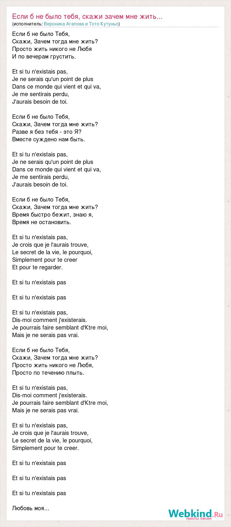 Если б не было Тебя, Скажи, Зачем тогда мне жить? Просто жить никого не Любя И по вечерам грустить. Et si tu n'existais pas, Je ne serais qu'un point de plus Dans ce monde qui vient et qui va, Je me sentirais perdu, J'aurais besoin de toi. Если б не было Тебя, Скажи, Зачем тогда мне жить? Разве я без тебя - это Я? Вместе суждено нам быть. Et si tu n'existais pas, Je ne serais qu'un point de plus Dans ce monde qui vient et qui va, Je me sentirais perdu, J'aurais besoin de toi. Если б не было Тебя, Скажи, Зачем тогда мне жить? Время быстро бежит, знаю я, Время не остановить. Et si tu n'existais pas, Je crois que je l'aurais trouve, Le secret de la vie, le pourquoi, Simplement pour te creer Et pour te regarder. Et si tu n'existais pas Et si tu n'existais pas Et si tu n'existais pas, Dis-moi comment j'existerais. Je pourrais faire semblant d'Кtre moi, Mais je ne serais pas vrai. Если б не было Тебя, Скажи, Зачем тогда мне жить? Просто жить никого не Любя, Просто по течению плыть. Et si tu n'existais pas, Dis-moi comment j'existerais. Je pourrais faire semblant d'Кtre moi, Mais je ne serais pas vrai. Et si tu n'existais pas, Je crois que je l'aurais trouve, Le secret de la vie, le pourquoi, Simplement pour te creer. Et si tu n'existais pas Et si tu n'existais pas Et si tu n'existais pas Любовь моя...