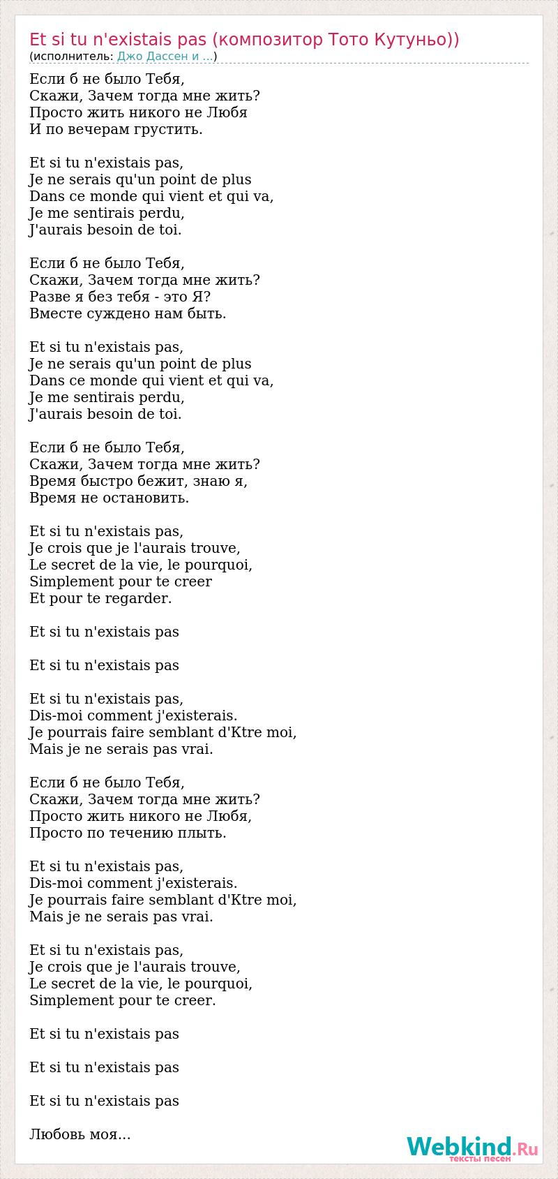 Если б не было Тебя, Скажи, Зачем тогда мне жить? Просто жить никого не Любя И по вечерам грустить. Et si tu n'existais pas, Je ne serais qu'un point de plus Dans ce monde qui vient et qui va, Je me sentirais perdu, J'aurais besoin de toi. Если б не было Тебя, Скажи, Зачем тогда мне жить? Разве я без тебя - это Я? Вместе суждено нам быть. Et si tu n'existais pas, Je ne serais qu'un point de plus Dans ce monde qui vient et qui va, Je me sentirais perdu, J'aurais besoin de toi. Если б не было Тебя, Скажи, Зачем тогда мне жить? Время быстро бежит, знаю я, Время не остановить. Et si tu n'existais pas, Je crois que je l'aurais trouve, Le secret de la vie, le pourquoi, Simplement pour te creer Et pour te regarder. Et si tu n'existais pas Et si tu n'existais pas Et si tu n'existais pas, Dis-moi comment j'existerais. Je pourrais faire semblant d'Кtre moi, Mais je ne serais pas vrai. Если б не было Тебя, Скажи, Зачем тогда мне жить? Просто жить никого не Любя, Просто по течению плыть. Et si tu n'existais pas, Dis-moi comment j'existerais. Je pourrais faire semblant d'Кtre moi, Mais je ne serais pas vrai. Et si tu n'existais pas, Je crois que je l'aurais trouve, Le secret de la vie, le pourquoi, Simplement pour te creer. Et si tu n'existais pas Et si tu n'existais pas Et si tu n'existais pas Любовь моя...