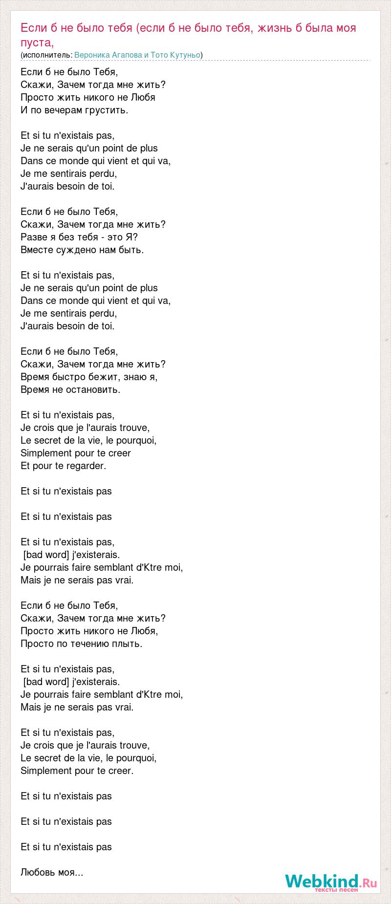 Если б не было Тебя, Скажи, Зачем тогда мне жить? Просто жить никого не Любя И по вечерам грустить. Et si tu n'existais pas, Je ne serais qu'un point de plus Dans ce monde qui vient et qui va, Je me sentirais perdu, J'aurais besoin de toi. Если б не было Тебя, Скажи, Зачем тогда мне жить? Разве я без тебя - это Я? Вместе суждено нам быть. Et si tu n'existais pas, Je ne serais qu'un point de plus Dans ce monde qui vient et qui va, Je me sentirais perdu, J'aurais besoin de toi. Если б не было Тебя, Скажи, Зачем тогда мне жить? Время быстро бежит, знаю я, Время не остановить. Et si tu n'existais pas, Je crois que je l'aurais trouve, Le secret de la vie, le pourquoi, Simplement pour te creer Et pour te regarder. Et si tu n'existais pas Et si tu n'existais pas Et si tu n'existais pas, [bad word] j'existerais. Je pourrais faire semblant d'Кtre moi, Mais je ne serais pas vrai. Если б не было Тебя, Скажи, Зачем тогда мне жить? Просто жить никого не Любя, Просто по течению плыть. Et si tu n'existais pas, [bad word] j'existerais. Je pourrais faire semblant d'Кtre moi, Mais je ne serais pas vrai. Et si tu n'existais pas, Je crois que je l'aurais trouve, Le secret de la vie, le pourquoi, Simplement pour te creer. Et si tu n'existais pas Et si tu n'existais pas Et si tu n'existais pas Любовь моя...
