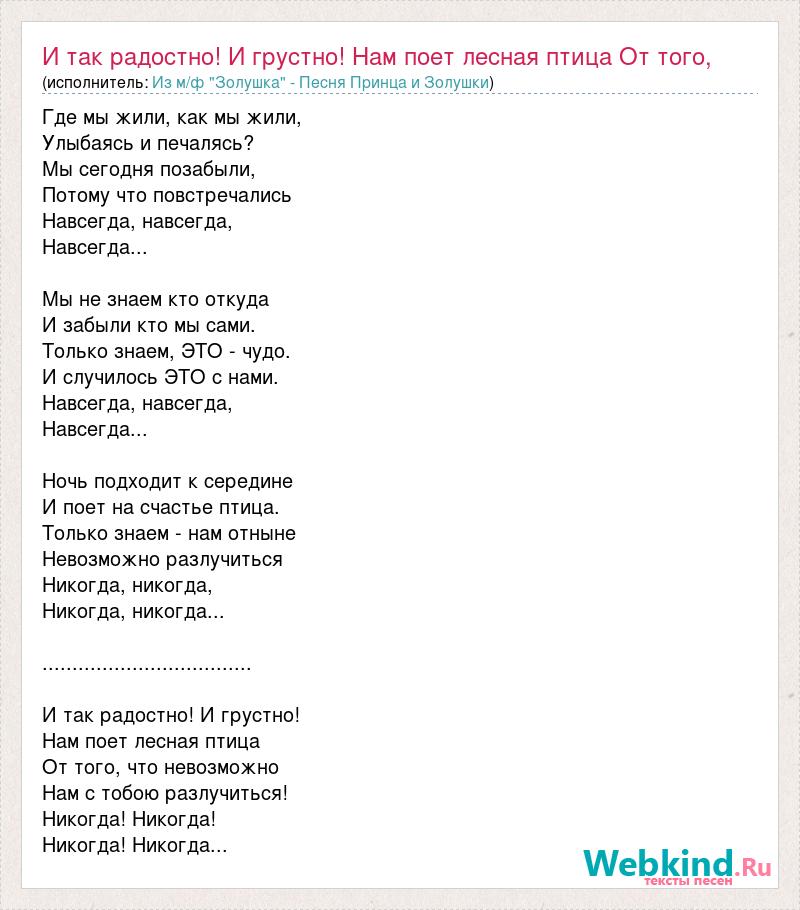 Где мы жили, как мы жили, Улыбаясь и печалясь? Мы сегодня позабыли, Потому что повстречались Навсегда, навсегда, Навсегда... Мы не знаем кто откуда И забыли кто мы сами. Только знаем, ЭТО - чудо. И случилось ЭТО с нами. Навсегда, навсегда, Навсегда... Ночь подходит к середине И поет на счастье птица. Только знаем - нам отныне Невозможно разлучиться Никогда, никогда, Никогда, никогда... ................................... И так радостно! И грустно! Нам поет лесная птица От того, что невозможно Нам с тобою разлучиться! Никогда! Никогда! Никогда! Никогда...