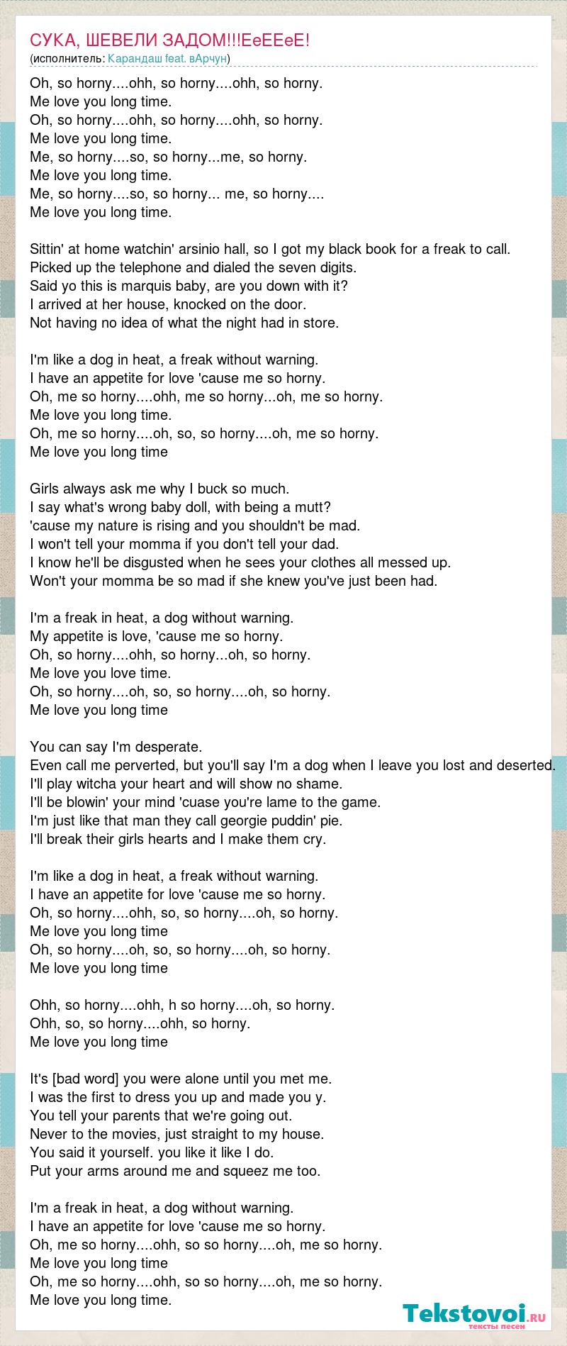 Oh, so horny....ohh, so horny....ohh, so horny. Me love you long time. Oh, so horny....ohh, so horny....ohh, so horny. Me love you long time. Me, so horny....so, so horny...me, so horny. Me love you long time. Me, so horny....so, so horny... me, so horny.... Me love you long time. Sittin' at home watchin' arsinio hall, so I got my black book for a freak to call. Picked up the telephone and dialed the seven digits. Said yo this is marquis baby, are you down with it? I arrived at her house, knocked on the door. Not having no idea of what the night had in store. I'm like a dog in heat, a freak without warning. I have an appetite for love 'cause me so horny. Oh, me so horny....ohh, me so horny...oh, me so horny. Me love you long time. Oh, me so horny....oh, so, so horny....oh, me so horny. Me love you long time Girls always ask me why I buck so much. I say what's wrong baby doll, with being a mutt? 'cause my nature is rising and you shouldn't be mad. I won't tell your momma if you don't tell your dad. I know he'll be disgusted when he sees your clothes all messed up. Won't your momma be so mad if she knew you've just been had. I'm a freak in heat, a dog without warning. My appetite is love, 'cause me so horny. Oh, so horny....ohh, so horny...oh, so horny. Me love you love time. Oh, so horny....oh, so, so horny....oh, so horny. Me love you long time You can say I'm desperate. Even call me perverted, but you'll say I'm a dog when I leave you lost and deserted. I'll play witcha your heart and will show no shame. I'll be blowin' your mind 'cuase you're lame to the game. I'm just like that man they call georgie puddin' pie. I'll break their girls hearts and I make them cry. I'm like a dog in heat, a freak without warning. I have an appetite for love 'cause me so horny. Oh, so horny....ohh, so, so horny....oh, so horny. Me love you long time Oh, so horny....oh, so, so horny....oh, so horny. Me love you long time Ohh, so horny....ohh, h so horny....oh, so horny. Ohh, so, so horny....ohh, so horny. Me love you long time It's true you were alone until you met me. I was the first to dress you up and made you y. You tell your parents that we're going out. Never to the movies, just straight to my house. You said it yourself. you like it like I do. Put your arms around me and squeez me too. I'm a freak in heat, a dog without warning. I have an appetite for love 'cause me so horny. Oh, me so horny....ohh, so so horny....oh, me so horny. Me love you long time Oh, me so horny....ohh, so so horny....oh, me so horny. Me love you long time.