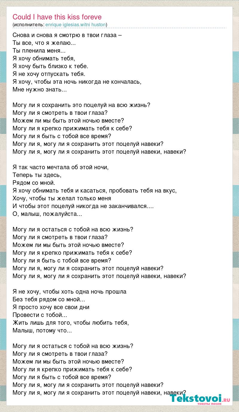 Снова и снова я смотрю в твои глаза – Ты все, что я желаю... Ты пленила меня... Я хочу обнимать тебя, Я хочу быть близко к тебе. Я не хочу отпускать тебя. Я хочу, чтобы эта ночь никогда не кончалась, Мне нужно знать... Могу ли я сохранить это поцелуй на всю жизнь? Могу ли я смотреть в твои глаза? Можем ли мы быть этой ночью вместе? Могу ли я крепко прижимать тебя к себе? Могу ли я быть с тобой все время? Могу ли я, могу ли я сохранить этот поцелуй навеки? Могу ли я, могу ли я сохранить этот поцелуй навеки, навеки? Я так часто мечтала об этой ночи, Теперь ты здесь, Рядом со мной. Я хочу обнимать тебя и касаться, пробовать тебя на вкус, Хочу, чтобы ты желал только меня И чтобы этот поцелуй никогда не заканчивался.... О, малыш, пожалуйста... Могу ли я остаться с тобой на всю жизнь? Могу ли я смотреть в твои глаза? Можем ли мы быть этой ночью вместе? Могу ли я крепко прижимать тебя к себе? Могу ли я быть с тобой все время? Могу ли я, могу ли я сохранить этот поцелуй навеки? Могу ли я, могу ли я сохранить этот поцелуй навеки, навеки? Я не хочу, чтобы хоть одна ночь прошла Без тебя рядом со мной... Я просто хочу все свои дни Провести с тобой... Жить лишь для того, чтобы любить тебя, Малыш, потому что... Могу ли я остаться с тобой на всю жизнь? Могу ли я смотреть в твои глаза? Можем ли мы быть этой ночью вместе? Могу ли я крепко прижимать тебя к себе? Могу ли я быть с тобой все время? Могу ли я, могу ли я сохранить этот поцелуй навеки? Могу ли я, могу ли я сохранить этот поцелуй навеки, навеки?