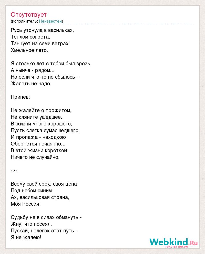 Русь утонула в васильках, Теплом согрета. Танцует на семи ветрах Хмельное лето. Я столько лет с тобой был врозь, А нынче - рядом... Но если что-то не сбылось - Жалеть не надо. Припев: Не жалейте о прожитом, Не кляните ушедшее. В жизни много хорошего, Пусть слегка сумасшедшего. И пропажа - находкою Обернется нечаянно... В этой жизни короткой Ничего не случайно. -2- Всему свой срок, своя цена Под небом синим. Ах, васильковая страна, Моя Россия! Судьбу не в силах обмануть - Жну, что посеял. Пускай, нелегок этот путь - Я не жалею!