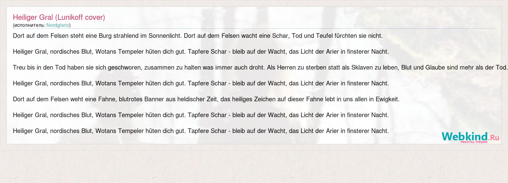 Dort auf dem Felsen steht eine Burg strahlend im Sonnenlicht. Dort auf dem Felsen wacht eine Schar, Tod und Teufel fürchten sie nicht. Heiliger Gral, nordisches Blut, Wotans Tempeler hüten dich gut. Tapfere Schar - bleib auf der Wacht, das Licht der Arier in finsterer Nacht. Treu bis in den Tod haben sie sich geschworen, zusammen zu halten was immer auch droht. Als Herren zu sterben statt als Sklaven zu leben, Blut und Glaube sind mehr als der Tod. Heiliger Gral, nordisches Blut, Wotans Tempeler hüten dich gut. Tapfere Schar - bleib auf der Wacht, das Licht der Arier in finsterer Nacht. Dort auf dem Felsen weht eine Fahne, blutrotes Banner aus heldischer Zeit, das heiliges Zeichen auf dieser Fahne lebt in uns allen in Ewigkeit. Heiliger Gral, nordisches Blut, Wotans Tempeler hüten dich gut. Tapfere Schar - bleib auf der Wacht, das Licht der Arier in finsterer Nacht. Heiliger Gral, nordisches Blut, Wotans Tempeler hüten dich gut. Tapfere Schar - bleib auf der Wacht, das Licht der Arier in finsterer Nacht.
