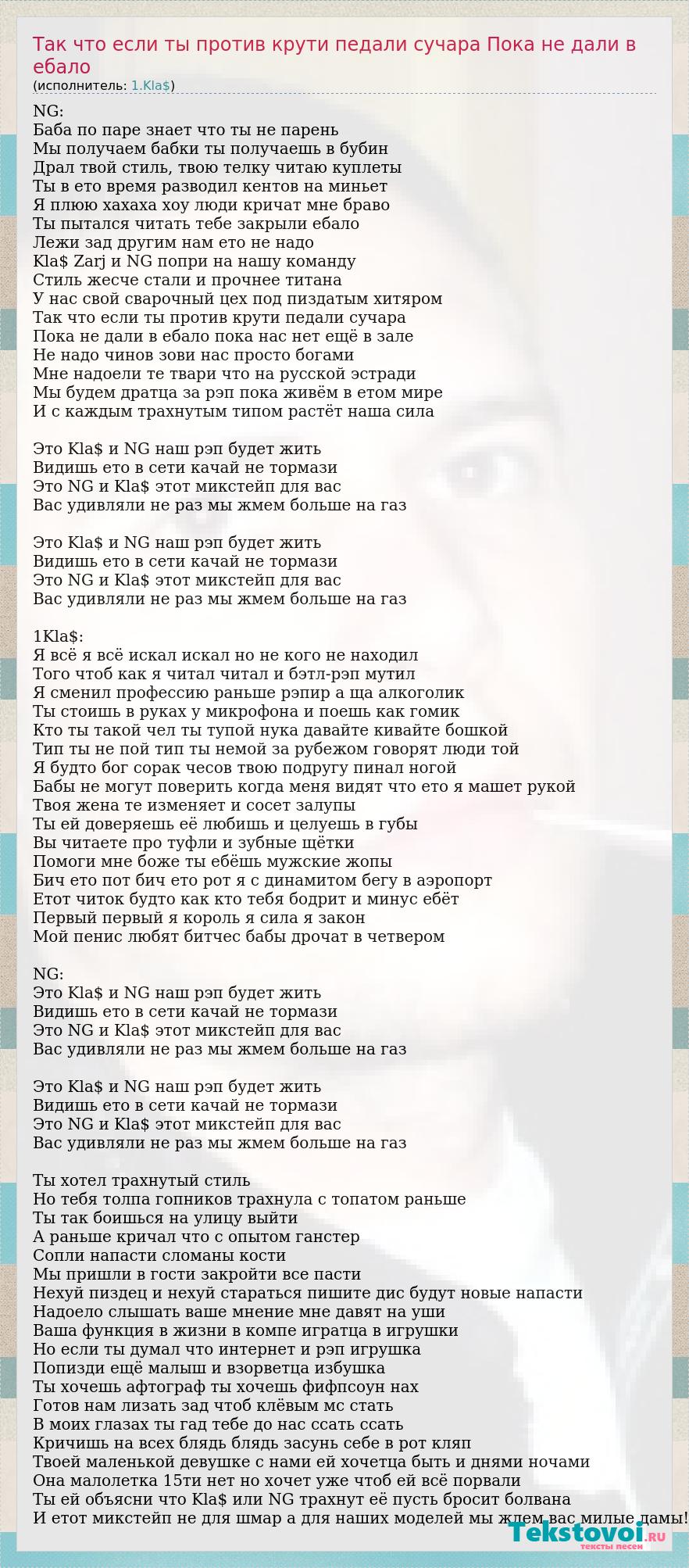 NG: Баба по паре знает что ты не парень Мы получаем бабки ты получаешь в бубин Драл твой стиль, твою телку читаю куплеты Ты в ето время разводил кентов на миньет Я плюю хахаха хоу люди кричат мне браво Ты пытался читать тебе закрыли ебало Лежи зад другим нам ето не надо Kla$ Zarj и NG попри на нашу команду Стиль жесче стали и прочнее титана У нас свой сварочный цех под пиздатым хитяром Так что если ты против крути педали сучара Пока не дали в ебало пока нас нет ещё в зале Не надо чинов зови нас просто богами Мне надоели те твари что на русской эстради Мы будем дратца за рэп пока живём в етом мире И с каждым трахнутым типом растёт наша сила Это Kla$ и NG наш рэп будет жить Видишь ето в сети качай не тормази Это NG и Kla$ этот микстейп для вас Вас удивляли не раз мы жмем больше на газ Это Kla$ и NG наш рэп будет жить Видишь ето в сети качай не тормази Это NG и Kla$ этот микстейп для вас Вас удивляли не раз мы жмем больше на газ 1Kla$: Я всё я всё искал искал но не кого не находил Того чтоб как я читал читал и бэтл-рэп мутил Я сменил профессию раньше рэпир а ща алкоголик Ты стоишь в руках у микрофона и поешь как гомик Кто ты такой чел ты тупой нука давайте кивайте бошкой Тип ты не пой тип ты немой за рубежом говорят люди той Я будто бог сорак чесов твою подругу пинал ногой Бабы не могут поверить когда меня видят что ето я машет рукой Твоя жена те изменяет и сосет залупы Ты ей доверяешь её любишь и целуешь в губы Вы читаете про туфли и зубные щётки Помоги мне боже ты ебёшь мужские жопы Бич ето пот бич ето рот я с динамитом бегу в аэропорт Етот читок будто как кто тебя бодрит и минус ебёт Первый первый я король я сила я закон Мой пенис любят битчес бабы дрочат в четвером NG: Это Kla$ и NG наш рэп будет жить Видишь ето в сети качай не тормази Это NG и Kla$ этот микстейп для вас Вас удивляли не раз мы жмем больше на газ Это Kla$ и NG наш рэп будет жить Видишь ето в сети качай не тормази Это NG и Kla$ этот микстейп для вас Вас удивляли не раз мы жмем больше на газ Ты хотел трахнутый стиль Но тебя толпа гопников трахнула с топатом раньше Ты так боишься на улицу выйти А раньше кричал что с опытом ганстер Сопли напасти сломаны кости Мы пришли в гости закройти все пасти Нехуй пиздец и нехуй стараться пишите дис будут новые напасти Надоело слышать ваше мнение мне давят на уши Ваша функция в жизни в компе игратца в игрушки Но если ты думал что интернет и рэп игрушка Попизди ещё малыш и взорветца избушка Ты хочешь афтограф ты хочешь фифпсоун нах Готов нам лизать зад чтоб клёвым мс стать В моих глазах ты гад тебе до нас ссать ссать Кричишь на всех блядь блядь засунь себе в рот кляп Твоей маленькой девушке с нами ей хочетца быть и днями ночами Она малолетка 15ти нет но хочет уже чтоб ей всё порвали Ты ей объясни что Kla$ или NG трахнут её пусть бросит болвана И етот микстейп не для шмар а для наших моделей мы ждем вас милые дамы!