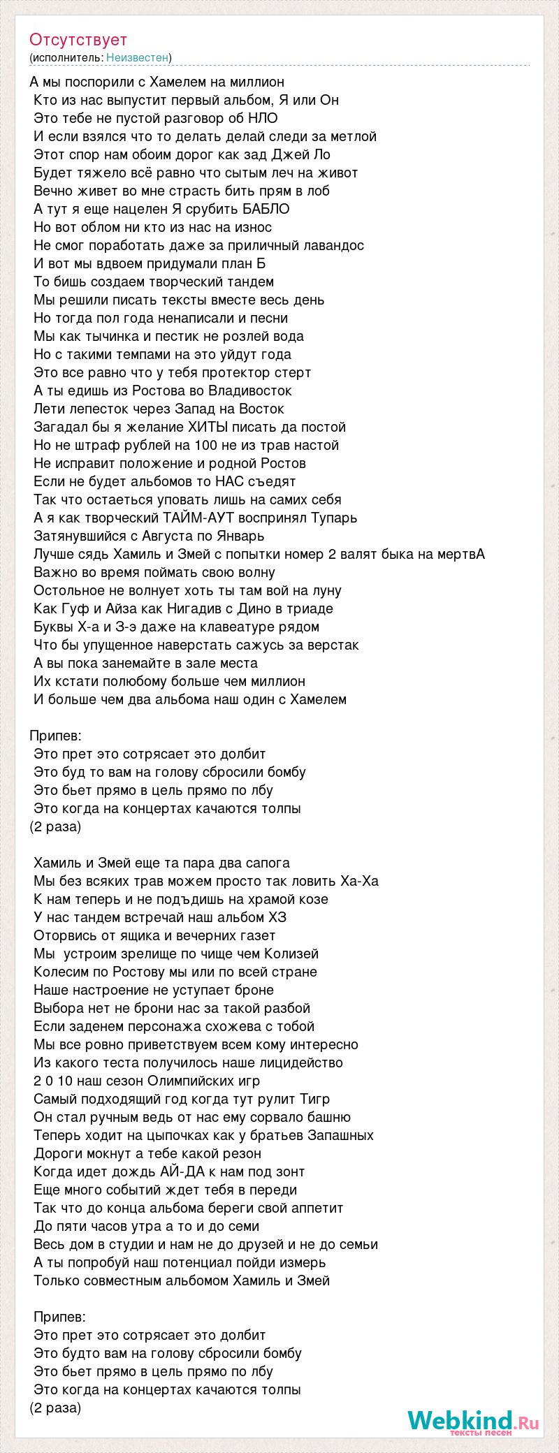 А мы поспорили с Хамелем на миллион Кто из нас выпустит первый альбом, Я или Он Это тебе не пустой разговор об НЛО И если взялся что то делать делай следи за метлой Этот спор нам обоим дорог как зад Джей Ло Будет тяжело всё равно что сытым леч на живот Вечно живет во мне страсть бить прям в лоб А тут я еще нацелен Я срубить БАБЛО Но вот облом ни кто из нас на износ Не смог поработать даже за приличный лавандос И вот мы вдвоем придумали план Б То бишь создаем творческий тандем Мы решили писать тексты вместе весь день Но тогда пол года ненаписали и песни Мы как тычинка и пестик не розлей вода Но с такими темпами на это уйдут года Это все равно что у тебя протектор стерт А ты едишь из Ростова во Владивосток Лети лепесток через Запад на Восток Загадал бы я желание ХИТЫ писать да постой Но не штраф рублей на 100 не из трав настой Не исправит положение и родной Ростов Если не будет альбомов то НАС съедят Так что остаеться уповать лишь на самих себя А я как творческий ТАЙМ-АУТ воспринял Тупарь Затянувшийся с Августа по Январь Лучше сядь Хамиль и Змей с попытки номер 2 валят быка на мертвА Важно во время поймать свою волну Остольное не волнует хоть ты там вой на луну Как Гуф и Айза как Нигадив с Дино в триаде Буквы Х-а и З-э даже на клавеатуре рядом Что бы упущенное наверстать сажусь за верстак А вы пока занемайте в зале места Их кстати полюбому больше чем миллион И больше чем два альбома наш один с Хамелем Припев: Это прет это сотрясает это долбит Это буд то вам на голову сбросили бомбу Это бьет прямо в цель прямо по лбу Это когда на концертах качаются толпы (2 раза) Хамиль и Змей еще та пара два сапога Мы без всяких трав можем просто так ловить Ха-Ха К нам теперь и не подъдишь на храмой козе У нас тандем встречай наш альбом ХЗ Оторвись от ящика и вечерних газет Мы устроим зрелище по чище чем Колизей Колесим по Ростову мы или по всей стране Наше настроение не уступает броне Выбора нет не брони нас за такой разбой Если заденем персонажа схожева с тобой Мы все ровно приветствуем всем кому интересно Из какого теста получилось наше лицидейство 2 0 10 наш сезон Олимпийских игр Самый подходящий год когда тут рулит Тигр Он стал ручным ведь от нас ему сорвало башню Теперь ходит на цыпочках как у братьев Запашных Дороги мокнут а тебе какой резон Когда идет дождь АЙ-ДА к нам под зонт Еще много событий ждет тебя в переди Так что до конца альбома береги свой аппетит До пяти часов утра а то и до семи Весь дом в студии и нам не до друзей и не до семьи А ты попробуй наш потенциал пойди измерь Только совместным альбомом Хамиль и Змей Припев: Это прет это сотрясает это долбит Это будто вам на голову сбросили бомбу Это бьет прямо в цель прямо по лбу Это когда на концертах качаются толпы (2 раза)