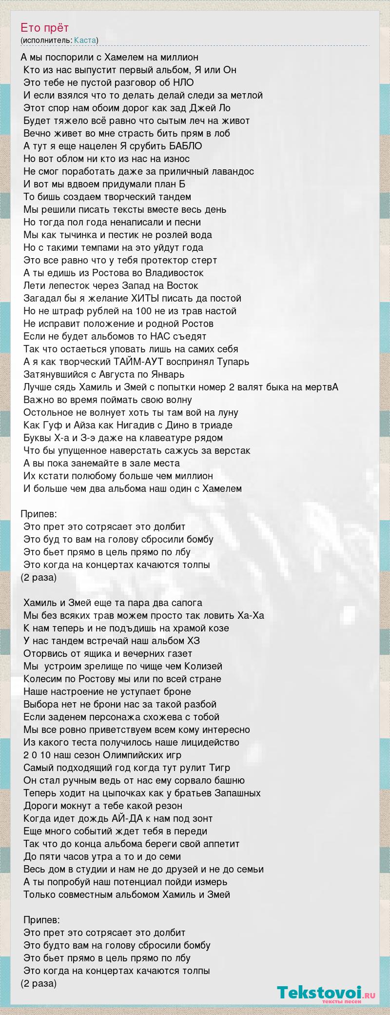 А мы поспорили с Хамелем на миллион Кто из нас выпустит первый альбом, Я или Он Это тебе не пустой разговор об НЛО И если взялся что то делать делай следи за метлой Этот спор нам обоим дорог как зад Джей Ло Будет тяжело всё равно что сытым леч на живот Вечно живет во мне страсть бить прям в лоб А тут я еще нацелен Я срубить БАБЛО Но вот облом ни кто из нас на износ Не смог поработать даже за приличный лавандос И вот мы вдвоем придумали план Б То бишь создаем творческий тандем Мы решили писать тексты вместе весь день Но тогда пол года ненаписали и песни Мы как тычинка и пестик не розлей вода Но с такими темпами на это уйдут года Это все равно что у тебя протектор стерт А ты едишь из Ростова во Владивосток Лети лепесток через Запад на Восток Загадал бы я желание ХИТЫ писать да постой Но не штраф рублей на 100 не из трав настой Не исправит положение и родной Ростов Если не будет альбомов то НАС съедят Так что остаеться уповать лишь на самих себя А я как творческий ТАЙМ-АУТ воспринял Тупарь Затянувшийся с Августа по Январь Лучше сядь Хамиль и Змей с попытки номер 2 валят быка на мертвА Важно во время поймать свою волну Остольное не волнует хоть ты там вой на луну Как Гуф и Айза как Нигадив с Дино в триаде Буквы Х-а и З-э даже на клавеатуре рядом Что бы упущенное наверстать сажусь за верстак А вы пока занемайте в зале места Их кстати полюбому больше чем миллион И больше чем два альбома наш один с Хамелем Припев: Это прет это сотрясает это долбит Это буд то вам на голову сбросили бомбу Это бьет прямо в цель прямо по лбу Это когда на концертах качаются толпы (2 раза) Хамиль и Змей еще та пара два сапога Мы без всяких трав можем просто так ловить Ха-Ха К нам теперь и не подъдишь на храмой козе У нас тандем встречай наш альбом ХЗ Оторвись от ящика и вечерних газет Мы устроим зрелище по чище чем Колизей Колесим по Ростову мы или по всей стране Наше настроение не уступает броне Выбора нет не брони нас за такой разбой Если заденем персонажа схожева с тобой Мы все ровно приветствуем всем кому интересно Из какого теста получилось наше лицидейство 2 0 10 наш сезон Олимпийских игр Самый подходящий год когда тут рулит Тигр Он стал ручным ведь от нас ему сорвало башню Теперь ходит на цыпочках как у братьев Запашных Дороги мокнут а тебе какой резон Когда идет дождь АЙ-ДА к нам под зонт Еще много событий ждет тебя в переди Так что до конца альбома береги свой аппетит До пяти часов утра а то и до семи Весь дом в студии и нам не до друзей и не до семьи А ты попробуй наш потенциал пойди измерь Только совместным альбомом Хамиль и Змей Припев: Это прет это сотрясает это долбит Это будто вам на голову сбросили бомбу Это бьет прямо в цель прямо по лбу Это когда на концертах качаются толпы (2 раза)
