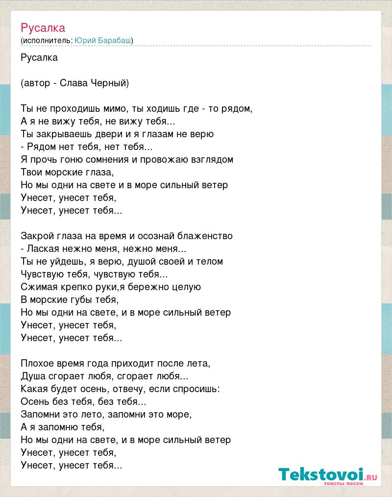 Русалка (автор - Слава Черный) Ты не проходишь мимо, ты ходишь где - то рядом, А я не вижу тебя, не вижу тебя... Ты закрываешь двери и я глазам не верю - Рядом нет тебя, нет тебя... Я прочь гоню сомнения и провожаю взглядом Твои морские глаза, Но мы одни на свете и в море сильный ветер Унесет, унесет тебя, Унесет, унесет тебя... Закрой глаза на время и осознай блаженство - Лаская нежно меня, нежно меня... Ты не уйдешь, я верю, душой своей и телом Чувствую тебя, чувствую тебя... Сжимая крепко руки,я бережно целую В морские губы тебя, Но мы одни на свете, и в море сильный ветер Унесет, унесет тебя, Унесет, унесет тебя... Плохое время года приходит после лета, Душа сгорает любя, сгорает любя... Какая будет осень, отвечу, если спросишь: Осень без тебя, без тебя... Запомни это лето, запомни это море, А я запомню тебя, Но мы одни на свете, и в море сильный ветер Унесет, унесет тебя, Унесет, унесет тебя...