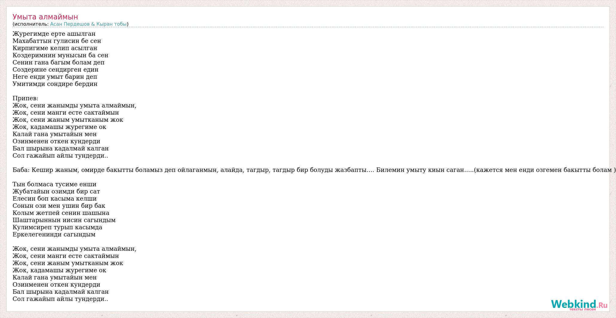 Журегимде ерте ашылган Махабаттын гулисин бе сен Кирпигиме келип асылган Коздеримнин мунысын ба сен Сенин гана багым болам деп Создерине сендирген един Неге енди умыт барин деп Умитимди сондире бердин Припев: Жок, сени жанымды умыта алмаймын, Жок, сени манги есте сактаймын Жок, сени жаным умытканым жок Жок, кадамашы журегиме ок Калай гана умытайын мен Озинменен откен кундерди Бал шырына кадалмай калган Сол гажайып айлы тундерди.. Баба: Кешир жаным, омирде бакытты боламыз деп ойлаганмын, алайда, тагдыр, тагдыр бир болуды жазбапты…. Билемин умыту киын саган…..(кажется мен енди озгемен бакытты болам ) Тын болмаса тусиме енши Жубатайын озимди бир сат Елесин боп касыма келши Сонын ози мен ушин бир бак Колым жетпей сенин шашына Шаштарыннын иисин сагындым Кулимсиреп турып касымда Еркелегенинди сагындым Жок, сени жанымды умыта алмаймын, Жок, сени манги есте сактаймын Жок, сени жаным умытканым жок Жок, кадамашы журегиме ок Калай гана умытайын мен Озинменен откен кундерди Бал шырына кадалмай калган Сол гажайып айлы тундерди..