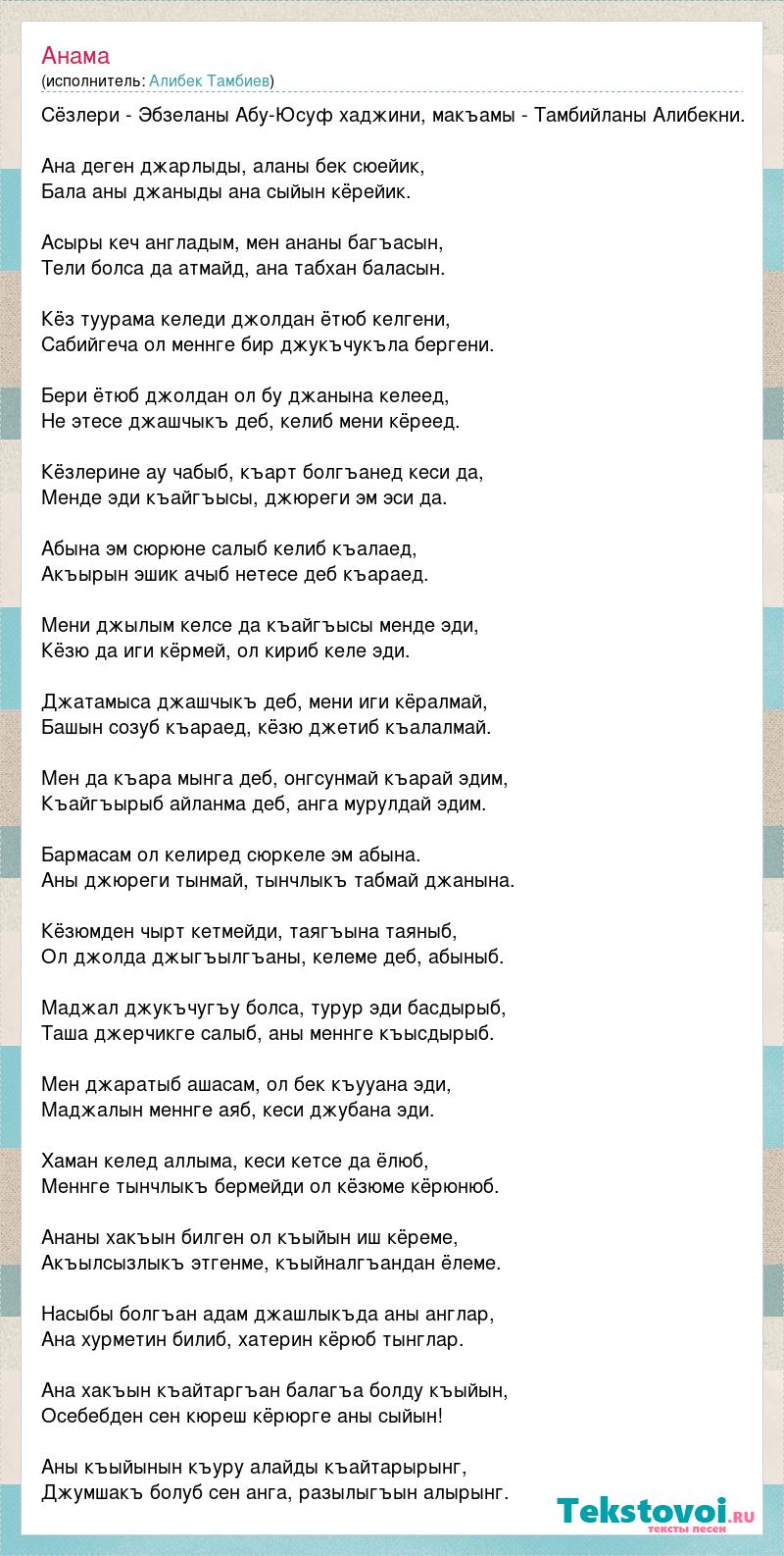 Сёзлери - Эбзеланы Абу-Юсуф хаджини, макъамы - Тамбийланы Алибекни. Ана деген джарлыды, аланы бек сюейик, Бала аны джаныды ана сыйын кёрейик. Асыры кеч англадым, мен ананы багъасын, Тели болса да атмайд, ана табхан баласын. Кёз туурама келеди джолдан ётюб келгени, Сабийгеча ол меннге бир джукъчукъла бергени. Бери ётюб джолдан ол бу джанына келеед, Не этесе джашчыкъ деб, келиб мени кёреед. Кёзлерине ау чабыб, къарт болгъанед кеси да, Менде эди къайгъысы, джюреги эм эси да. Абына эм сюрюне салыб келиб къалаед, Акъырын эшик ачыб нетесе деб къараед. Мени джылым келсе да къайгъысы менде эди, Кёзю да иги кёрмей, ол кириб келе эди. Джатамыса джашчыкъ деб, мени иги кёралмай, Башын созуб къараед, кёзю джетиб къалалмай. Мен да къара мынга деб, онгсунмай къарай эдим, Къайгъырыб айланма деб, анга мурулдай эдим. Бармасам ол келиред сюркеле эм абына. Аны джюреги тынмай, тынчлыкъ табмай джанына. Кёзюмден чырт кетмейди, таягъына таяныб, Ол джолда джыгъылгъаны, келеме деб, абыныб. Маджал джукъчугъу болса, турур эди басдырыб, Таша джерчикге салыб, аны меннге къысдырыб. Мен джаратыб ашасам, ол бек къууана эди, Маджалын меннге аяб, кеси джубана эди. Хаман келед аллыма, кеси кетсе да ёлюб, Меннге тынчлыкъ бермейди ол кёзюме кёрюнюб. Ананы хакъын билген ол къыйын иш кёреме, Акъылсызлыкъ этгенме, къыйналгъандан ёлеме. Насыбы болгъан адам джашлыкъда аны англар, Ана хурметин билиб, хатерин кёрюб тынглар. Ана хакъын къайтаргъан балагъа болду къыйын, Осебебден сен кюреш кёрюрге аны сыйын! Аны къыйынын къуру алайды къайтарырынг, Джумшакъ болуб сен анга, разылыгъын алырынг.