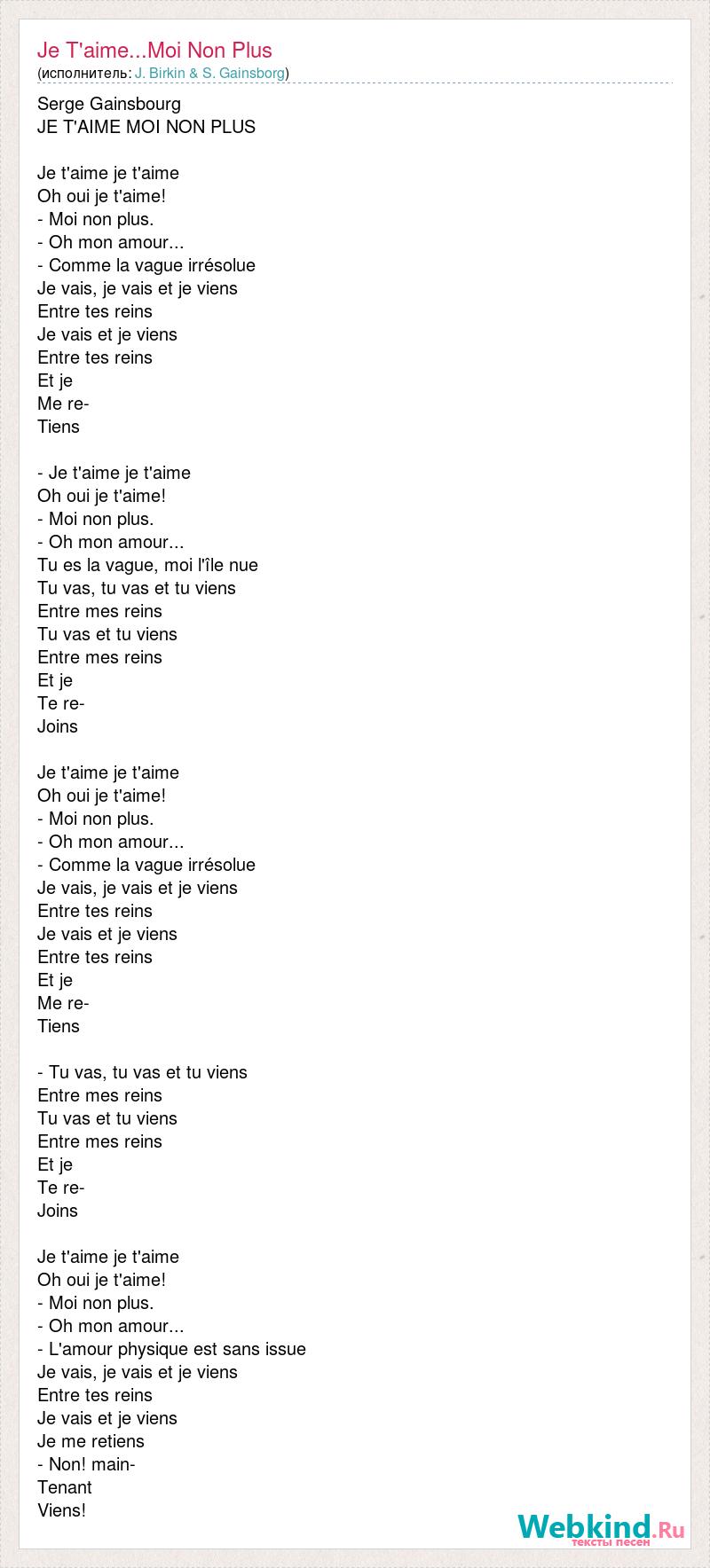 Serge Gainsbourg JE T'AIME MOI NON PLUS Je t'aime je t'aime Oh oui je t'aime! - Moi non plus. - Oh mon amour... - Comme la vague irrésolue Je vais, je vais et je viens Entre tes reins Je vais et je viens Entre tes reins Et je Me re- Tiens - Je t'aime je t'aime Oh oui je t'aime! - Moi non plus. - Oh mon amour... Tu es la vague, moi l'île nue Tu vas, tu vas et tu viens Entre mes reins Tu vas et tu viens Entre mes reins Et je Te re- Joins Je t'aime je t'aime Oh oui je t'aime! - Moi non plus. - Oh mon amour... - Comme la vague irrésolue Je vais, je vais et je viens Entre tes reins Je vais et je viens Entre tes reins Et je Me re- Tiens - Tu vas, tu vas et tu viens Entre mes reins Tu vas et tu viens Entre mes reins Et je Te re- Joins Je t'aime je t'aime Oh oui je t'aime! - Moi non plus. - Oh mon amour... - L'amour physique est sans issue Je vais, je vais et je viens Entre tes reins Je vais et je viens Je me retiens - Non! main- Tenant Viens!