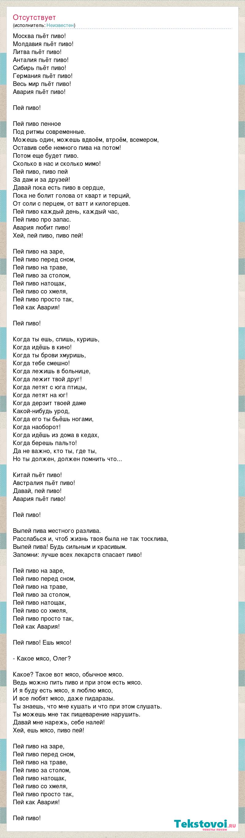 Москва пьёт пиво! Молдавия пьёт пиво! Литва пьёт пиво! Анталия пьёт пиво! Сибирь пьёт пиво! Германия пьёт пиво! Весь мир пьёт пиво! Авария пьёт пиво! Пей пиво! Пей пиво пенное Под ритмы современные. Можешь один, можешь вдвоём, втроём, всемером, Оставив себе немного пива на потом! Потом еще будет пиво. Сколько в нас и сколько мимо! Пей пиво, пиво пей За дам и за друзей! Давай пока есть пиво в сердце, Пока не болит голова от кварт и терций, От соли с перцем, от ватт и килогерцев. Пей пиво каждый день, каждый час, Пей пиво про запас. Авария любит пиво! Хей, пей пиво, пиво пей! Пей пиво на заре, Пей пиво перед сном, Пей пиво на траве, Пей пиво за столом, Пей пиво натощак, Пей пиво со хмеля, Пей пиво просто так, Пей как Авария! Пей пиво! Когда ты ешь, спишь, куришь, Когда идёшь в кино! Когда ты брови хмуришь, Когда тебе смешно! Когда лежишь в больнице, Когда лежит твой друг! Когда летят с юга птицы, Когда летят на юг! Когда дерзит твоей даме Какой-нибудь урод, Когда его ты бьёшь ногами, Когда наоборот! Когда идёшь из дома в кедах, Когда берешь пальто! Да не важно, кто ты, где ты, Но ты должен, должен помнить что... Китай пьёт пиво! Австралия пьёт пиво! Давай, пей пиво! Авария пьёт пиво! Пей пиво! Выпей пива местного разлива. Расслабься и, чтоб жизнь твоя была не так тосклива, Выпей пива! Будь сильным и красивым. Запомни: лучше всех лекарств спасает пиво! Пей пиво на заре, Пей пиво перед сном, Пей пиво на траве, Пей пиво за столом, Пей пиво натощак, Пей пиво со хмеля, Пей пиво просто так, Пей как Авария! Пей пиво! Ешь мясо! - Какое мясо, Олег? Какое? Такое вот мясо, обычное мясо. Ведь можно пить пиво и при этом есть мясо. И я буду есть мясо, я люблю мясо, И все любят мясо, даже пидаразы. Ты знаешь, что мне кушать и что при этом слушать. Ты можешь мне так пищеварение нарушить. Давай мне нарежь, себе налей! Хей, ешь мясо, пиво пей! Пей пиво на заре, Пей пиво перед сном, Пей пиво на траве, Пей пиво за столом, Пей пиво натощак, Пей пиво со хмеля, Пей пиво просто так, Пей как Авария! Пей пиво!