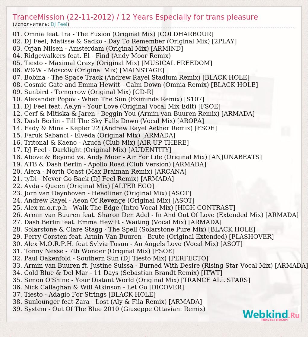 01. Omnia feat. Ira - The Fusion (Original Mix) [COLDHARBOUR] 02. DJ Feel, Matisse & Sadko - Day To Remember (Original Mix) [2PLAY] 03. Orjan Nilsen - Amsterdam (Original Mix) [ARMIND] 04. Ridgewalkers feat. El - Find (Andy Moor Remix) 05. Tiesto - Maximal Crazy (Original Mix) [MUSICAL FREEDOM] 06. W&W - Moscow (Original Mix) [MAINSTAGE] 07. Bobina - The Space Track (Andrew Rayel Stadium Remix) [BLACK HOLE] 08. Cosmic Gate and Emma Hewitt - Calm Down (Omnia Remix) [BLACK HOLE] 09. Sunbird - Tomorrow (Original Mix) [CD-R] 10. Alexander Popov - When The Sun (Eximinds Remix) [S107] 11. DJ Feel feat. Aelyn - Your Love (Original Vocal Mix Edit) [FSOE] 12. Cerf & Mitiska & Jaren - Beggin You (Armin van Buuren Remix) [ARMADA] 13. Dash Berlin - Till The Sky Falls Down (Vocal Mix) [AROPA] 14. Fady & Mina - Kepler 22 (Andrew Rayel Aether Remix) [FSOE] 15. Faruk Sabanci - Elveda (Original Mix) [ARMADA] 16. Tritonal & Kaeno - Azuca (Club Mix) [AIR UP THERE] 17. DJ Feel - Darklight (Original Mix) [AUDENTITY] 18. Above & Beyond vs. Andy Moor - Air For Life (Original Mix) [ANJUNABEATS] 19. ATB & Dash Berlin - Apollo Road (Club Version) [ARMADA] 20. Aiera - North Coast (Max Braiman Remix) [ARCANA] 21. tyDi - Never Go Back (DJ Feel Remix) [ARMADA] 22. Ayda - Queen (Original Mix) [ALTER EGO] 23. Jorn van Deynhoven - Headliner (Original Mix) [ASOT] 24. Andrew Rayel - Aeon Of Revenge (Original Mix) [ASOT] 25. Alex m.o.r.p.h - Walk The Edge (Intro Vocal Mix) [HIGH CONTRAST] 26. Armin van Buuren feat. Sharon Den Adel - In And Out Of Love (Extended Mix) [ARMADA] 27. Dash Berlin feat. Emma Hewitt - Waiting (Vocal Mix) [ARMADA] 28. Solarstone & Clare Stagg - The Spell (Solarstone Pure Mix) [BLACK HOLE] 29. Ferry Corsten feat. Armin Van Buuren - Brute (Original Extended) [FLASHOVER] 30. Alex M.O.R.P.H. feat Sylvia Tosun - An Angels Love (Vocal Mix) [ASOT] 31. Tonny Nesse - 7th Wonder (Original Mix) [FSOE] 32. Paul Oakenfold - Southern Sun (DJ Tiesto Mix) [PERFECTO] 33. Armin van Buuren ft. Justine Suissa - Burned With Desire (Rising Star Vocal Mix) [ARMADA] 34. Cold Blue & Del Mar - 11 Days (Sebastian Brandt Remix) [ITWT] 35. Simon O'Shine - Your Distant World (Original Mix) [TRANCE ALL STARS] 36. Nick Callaghan & Will Atkinson - Let Go [DICOVER] 37. Tiesto - Adagio For Strings [BLACK HOLE] 38. Sunlounger feat Zara - Lost (Aly & Fila Remix) [ARMADA] 39. System - Out Of The Blue 2010 (Giuseppe Ottaviani Remix)