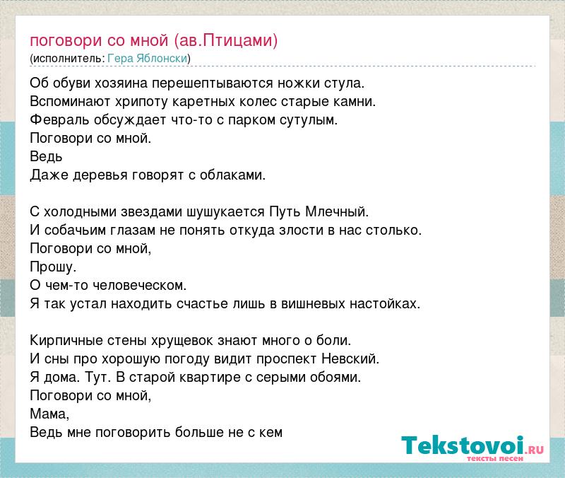 Об обуви хозяина перешептываются ножки стула. Вспоминают хрипоту каретных колес старые камни. Февраль обсуждает что-то с парком сутулым. Поговори со мной. Ведь Даже деревья говорят с облаками. С холодными звездами шушукается Путь Млечный. И собачьим глазам не понять откуда злости в нас столько. Поговори со мной, Прошу. О чем-то человеческом. Я так устал находить счастье лишь в вишневых настойках. Кирпичные стены хрущевок знают много о боли. И сны про хорошую погоду видит проспект Невский. Я дома. Тут. В старой квартире с серыми обоями. Поговори со мной, Мама, Ведь мне поговорить больше не с кем