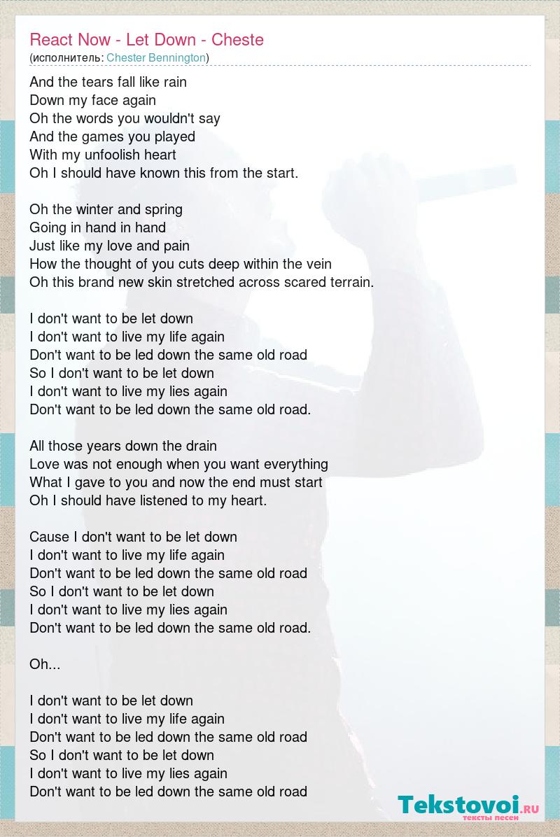And the tears fall like rain Down my face again Oh the words you wouldn't say And the games you played With my unfoolish heart Oh I should have known this from the start. Oh the winter and spring Going in hand in hand Just like my love and pain How the thought of you cuts deep within the vein Oh this brand new skin stretched across scared terrain. I don't want to be let down I don't want to live my life again Don't want to be led down the same old road So I don't want to be let down I don't want to live my lies again Don't want to be led down the same old road. All those years down the drain Love was not enough when you want everything What I gave to you and now the end must start Oh I should have listened to my heart. Cause I don't want to be let down I don't want to live my life again Don't want to be led down the same old road So I don't want to be let down I don't want to live my lies again Don't want to be led down the same old road. Oh... I don't want to be let down I don't want to live my life again Don't want to be led down the same old road So I don't want to be let down I don't want to live my lies again Don't want to be led down the same old road