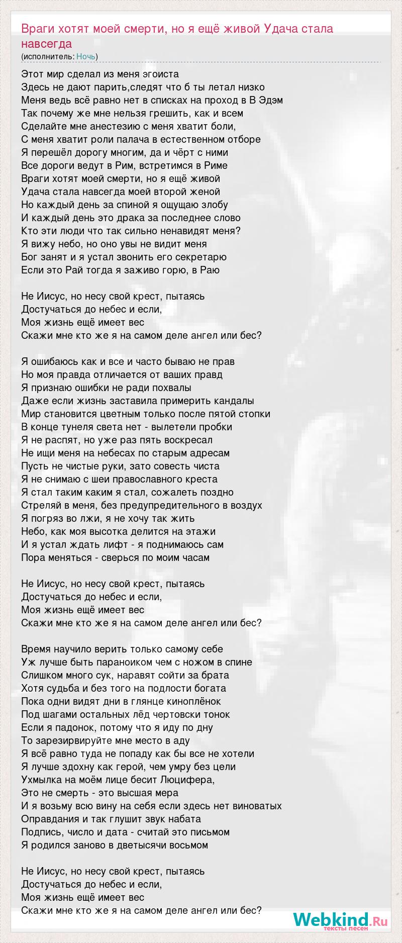 Этот мир сделал из меня эгоиста Здесь не дают парить,следят что б ты летал низко Меня ведь всё равно нет в списках на проход в В Эдэм Так почему же мне нельзя грешить, как и всем Сделайте мне анестезию с меня хватит боли, С меня хватит роли палача в естественном отборе Я перешёл дорогу многим, да и чёрт с ними Все дороги ведут в Рим, встретимся в Риме Враги хотят моей смерти, но я ещё живой Удача стала навсегда моей второй женой Но каждый день за спиной я ощущаю злобу И каждый день это драка за последнее слово Кто эти люди что так сильно ненавидят меня? Я вижу небо, но оно увы не видит меня Бог занят и я устал звонить его секретарю Если это Рай тогда я заживо горю, в Раю Не Иисус, но несу свой крест, пытаясь Достучаться до небес и если, Моя жизнь ещё имеет вес Скажи мне кто же я на самом деле ангел или бес? Я ошибаюсь как и все и часто бываю не прав Но моя правда отличается от ваших правд Я признаю ошибки не ради похвалы Даже если жизнь заставила примерить кандалы Мир становится цветным только после пятой стопки В конце тунеля света нет - вылетели пробки Я не распят, но уже раз пять воскресал Не ищи меня на небесах по старым адресам Пусть не чистые руки, зато совесть чиста Я не снимаю с шеи православного креста Я стал таким каким я стал, сожалеть поздно Стреляй в меня, без предупредительного в воздух Я погряз во лжи, я не хочу так жить Небо, как моя высотка делится на этажи И я устал ждать лифт - я поднимаюсь сам Пора меняться - сверься по моим часам Не Иисус, но несу свой крест, пытаясь Достучаться до небес и если, Моя жизнь ещё имеет вес Скажи мне кто же я на самом деле ангел или бес? Время научило верить только самому себе Уж лучше быть параноиком чем с ножом в спине Слишком много сук, наравят сойти за брата Хотя судьба и без того на подлости богата Пока одни видят дни в глянце киноплёнок Под шагами остальных лёд чертовски тонок Если я падонок, потому что я иду по дну То зарезирвируйте мне место в аду Я всё равно туда не попаду как бы все не хотели Я лучше здохну как герой, чем умру без цели Ухмылка на моём лице бесит Люцифера, Это не смерть - это высшая мера И я возьму всю вину на себя если здесь нет виноватых Оправдания и так глушит звук набата Подпись, число и дата - считай это письмом Я родился заново в дветысячи восьмом Не Иисус, но несу свой крест, пытаясь Достучаться до небес и если, Моя жизнь ещё имеет вес Скажи мне кто же я на самом деле ангел или бес?