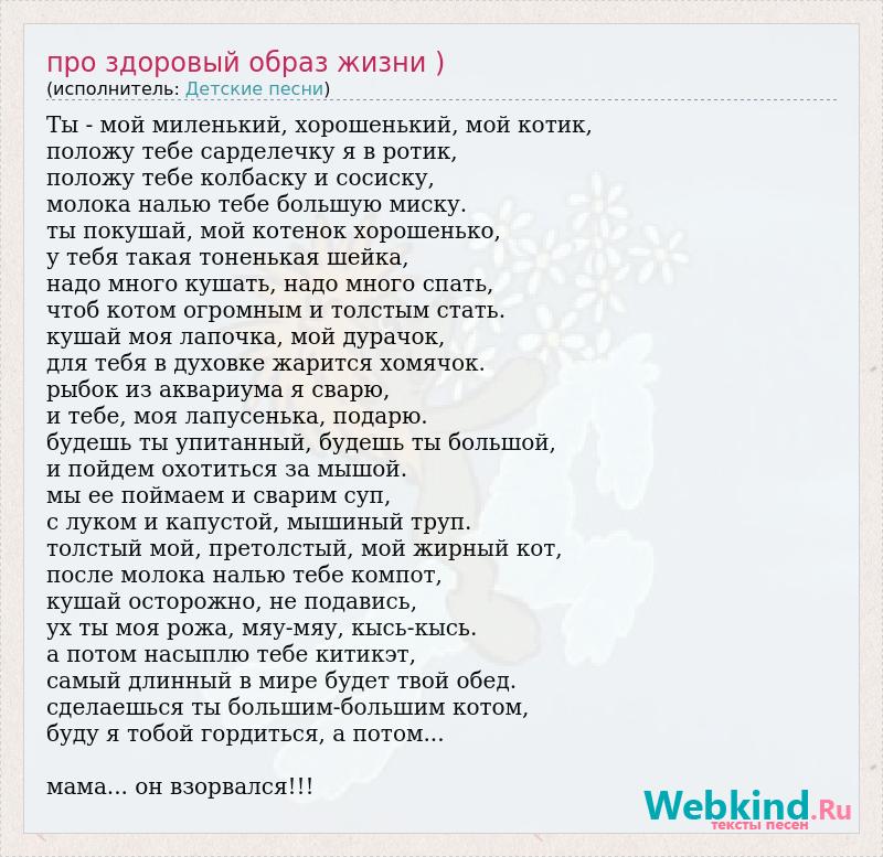 Ты - мой миленький, хорошенький, мой котик, положу тебе сарделечку я в ротик, положу тебе колбаску и сосиску, молока налью тебе большую миску. ты покушай, мой котенок хорошенько, у тебя такая тоненькая шейка, надо много кушать, надо много спать, чтоб котом огромным и толстым стать. кушай моя лапочка, мой дурачок, для тебя в духовке жарится хомячок. рыбок из аквариума я сварю, и тебе, моя лапусенька, подарю. будешь ты упитанный, будешь ты большой, и пойдем охотиться за мышой. мы ее поймаем и сварим суп, с луком и капустой, мышиный труп. толстый мой, претолстый, мой жирный кот, после молока налью тебе компот, кушай осторожно, не подавись, ух ты моя рожа, мяу-мяу, кысь-кысь. а потом насыплю тебе китикэт, самый длинный в мире будет твой обед. сделаешься ты большим-большим котом, буду я тобой гордиться, а потом... мама... он взорвался!!!