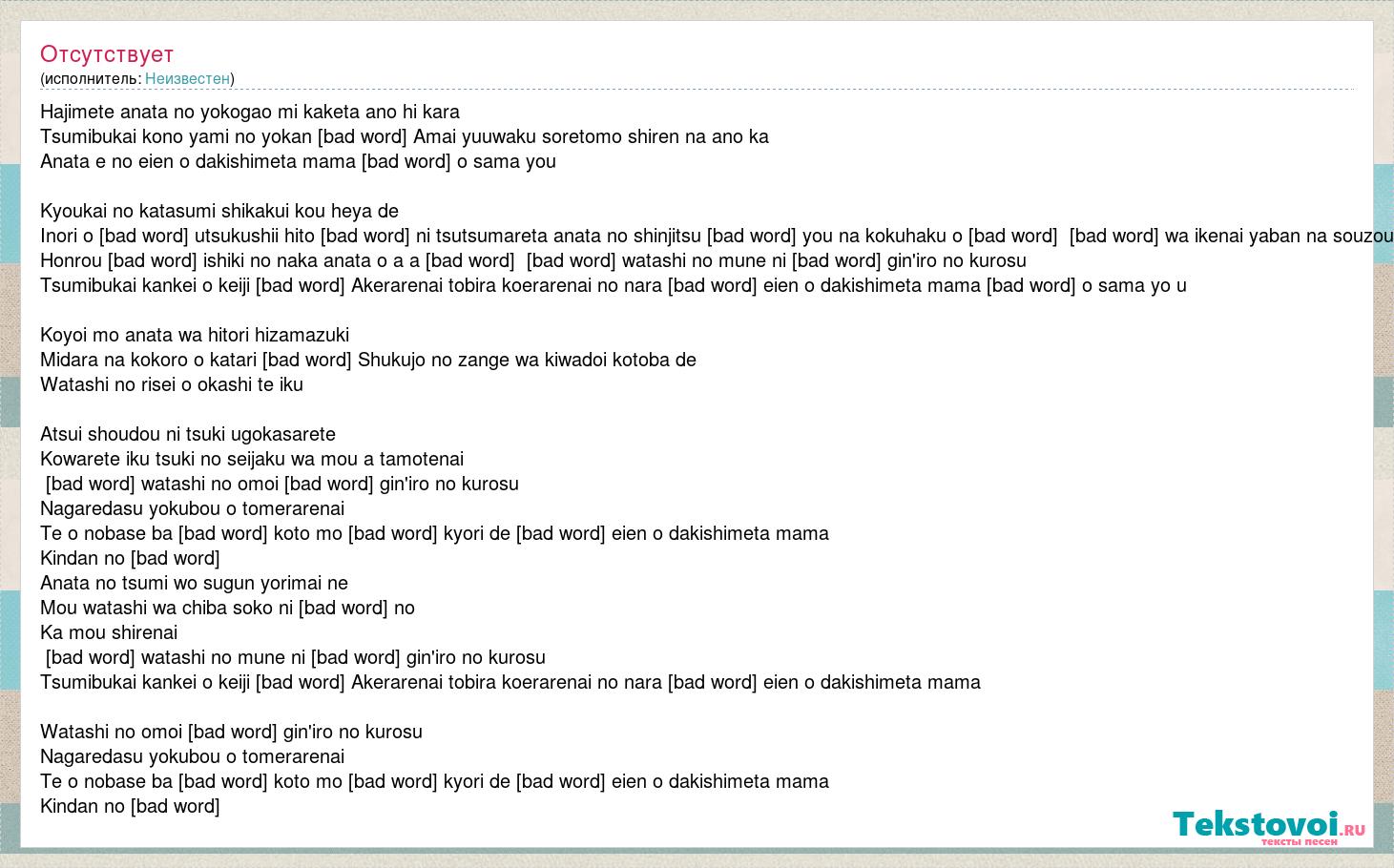 Hajimete anata no yokogao mi kaketa ano hi kara Tsumibukai kono yami no yokan [bad word] Amai yuuwaku soretomo shiren na ano ka Anata e no eien o dakishimeta mama Yoru o sama you Kyoukai no katasumi shikakui kou heya de Inori o sasageru utsukushii hito Beeru ni tsutsumareta anata no shinjitsu Nugisuteru you na kokuhaku o suru [bad word] wa ikenai yaban na souzou Honrou sareru ishiki no naka anata o a a aisuru [bad word] watashi no mune ni yureru gin'iro no kurosu Tsumibukai kankei o keiji [bad word] Akerarenai tobira koerarenai no nara Yurusareru eien o dakishimeta mama Yoru o sama yo u Koyoi mo anata wa hitori hizamazuki Midara na kokoro o katari hajimeru Shukujo no zange wa kiwadoi kotoba de Watashi no risei o okashi te iku Atsui shoudou ni tsuki ugokasarete Kowarete iku tsuki no seijaku wa mou a tamotenai [bad word] watashi no omoi shibaru gin'iro no kurosu Nagaredasu yokubou o tomerarenai Te o nobase ba fureru koto mo dekiru kyori de Mitasareru eien o dakishimeta mama Kindan no yoru Anata no tsumi wo sugun yorimai ne Mou watashi wa chiba soko ni ochiteiru no Ka mou shirenai [bad word] watashi no mune ni yureru gin'iro no kurosu Tsumibukai kankei o keiji [bad word] Akerarenai tobira koerarenai no nara Yurusareru eien o dakishimeta mama Watashi no omoi shibaru gin'iro no kurosu Nagaredasu yokubou o tomerarenai Te o nobase ba fureru koto mo dekiru kyori de Mitasareru eien o dakishimeta mama Kindan no yoru