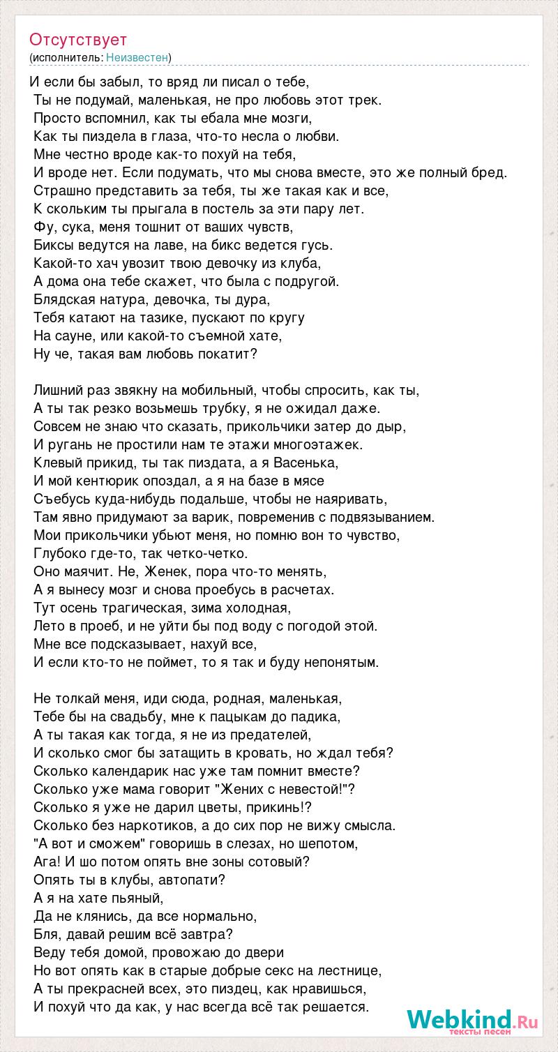 И если бы забыл, то вряд ли писал о тебе, Ты не подумай, маленькая, не про любовь этот трек. Просто вспомнил, как ты ебала мне мозги, Как ты пиздела в глаза, что-то несла о любви. Мне честно вроде как-то похуй на тебя, И вроде нет. Если подумать, что мы снова вместе, это же полный бред. Страшно представить за тебя, ты же такая как и все, К скольким ты прыгала в постель за эти пару лет. Фу, сука, меня тошнит от ваших чувств, Биксы ведутся на лаве, на бикс ведется гусь. Какой-то хач увозит твою девочку из клуба, А дома она тебе скажет, что была с подругой. Блядская натура, девочка, ты дура, Тебя катают на тазике, пускают по кругу На сауне, или какой-то съемной хате, Ну че, такая вам любовь покатит? Лишний раз звякну на мобильный, чтобы спросить, как ты, А ты так резко возьмешь трубку, я не ожидал даже. Совсем не знаю что сказать, прикольчики затер до дыр, И ругань не простили нам те этажи многоэтажек. Клевый прикид, ты так пиздата, а я Васенька, И мой кентюрик опоздал, а я на базе в мясе Съебусь куда-нибудь подальше, чтобы не наяривать, Там явно придумают за варик, повременив с подвязыванием. Мои прикольчики убьют меня, но помню вон то чувство, Глубоко где-то, так четко-четко. Оно маячит. Не, Женек, пора что-то менять, А я вынесу мозг и снова проебусь в расчетах. Тут осень трагическая, зима холодная, Лето в проеб, и не уйти бы под воду с погодой этой. Мне все подсказывает, нахуй все, И если кто-то не поймет, то я так и буду непонятым. Не толкай меня, иди сюда, родная, маленькая, Тебе бы на свадьбу, мне к пацыкам до падика, А ты такая как тогда, я не из предателей, И сколько смог бы затащить в кровать, но ждал тебя? Сколько календарик нас уже там помнит вместе? Сколько уже мама говорит "Жених с невестой!"? Сколько я уже не дарил цветы, прикинь!? Сколько без наркотиков, а до сих пор не вижу смысла. "А вот и сможем" говоришь в слезах, но шепотом, Ага! И шо потом опять вне зоны сотовый? Опять ты в клубы, автопати? А я на хате пьяный, Да не клянись, да все нормально, Бля, давай решим всё завтра? Веду тебя домой, провожаю до двери Но вот опять как в старые добрые секс на лестнице, А ты прекрасней всех, это пиздец, как нравишься, И похуй что да как, у нас всегда всё так решается.