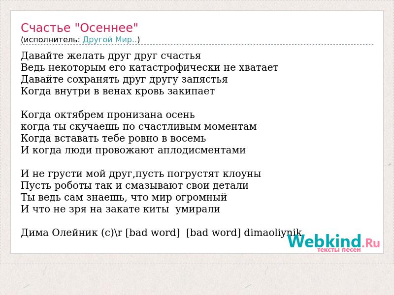 Давайте желать друг друг счастья Ведь некоторым его катастрофически не хватает Давайте сохранять друг другу запястья Когда внутри в венах кровь закипает Когда октябрем пронизана осень когда ты скучаешь по счастливым моментам Когда вставать тебе ровно в восемь И когда люди провожают аплодисментами И не грусти мой друг,пусть погрустят клоуны Пусть роботы так и смазывают свои детали Ты ведь сам знаешь, что мир огромный И что не зря на закате киты умирали Дима Олейник (с)\r [bad word] [bad word] dimaoliynik