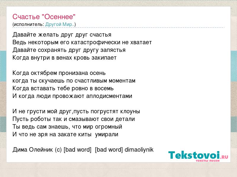 Давайте желать друг друг счастья Ведь некоторым его катастрофически не хватает Давайте сохранять друг другу запястья Когда внутри в венах кровь закипает Когда октябрем пронизана осень когда ты скучаешь по счастливым моментам Когда вставать тебе ровно в восемь И когда люди провожают аплодисментами И не грусти мой друг,пусть погрустят клоуны Пусть роботы так и смазывают свои детали Ты ведь сам знаешь, что мир огромный И что не зря на закате киты умирали Дима Олейник (с) [bad word] [bad word] dimaoliynik