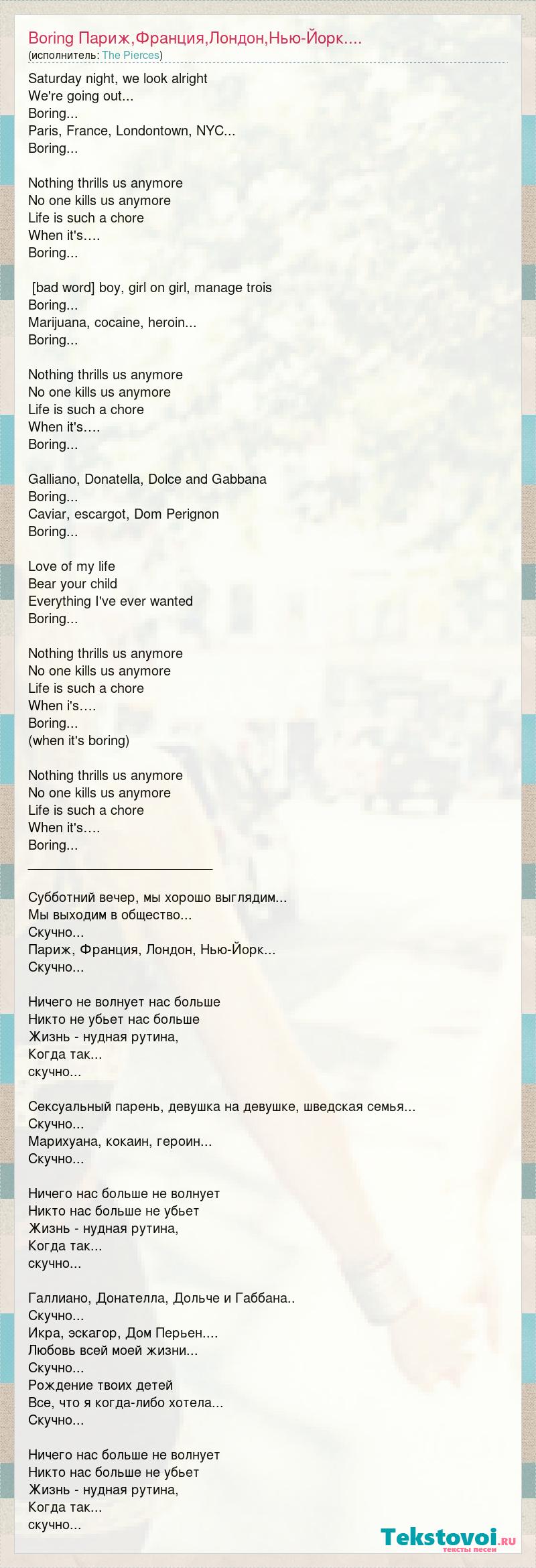Saturday night, we look alright We're going out... Boring... Paris, France, Londontown, NYC... Boring... Nothing thrills us anymore No one kills us anymore Life is such a chore When it's…. Boring... [bad word] boy, girl on girl, manage trois Boring... Marijuana, cocaine, heroin... Boring... Nothing thrills us anymore No one kills us anymore Life is such a chore When it's…. Boring... Galliano, Donatella, Dolce and Gabbana Boring... Caviar, escargot, Dom Perignon Boring... Love of my life Bear your child Everything I've ever wanted Boring... Nothing thrills us anymore No one kills us anymore Life is such a chore When i's…. Boring... (when it's boring) Nothing thrills us anymore No one kills us anymore Life is such a chore When it's…. Boring... _________________________ Субботний вечер, мы хорошо выглядим... Мы выходим в общество... Скучно... Париж, Франция, Лондон, Нью-Йорк... Скучно... Ничего не волнует нас больше Никто не убьет нас больше Жизнь - нудная рутина, Когда так... скучно... Сексуальный парень, девушка на девушке, шведская семья... Скучно... Марихуана, кокаин, героин... Скучно... Ничего нас больше не волнует Никто нас больше не убьет Жизнь - нудная рутина, Когда так... скучно... Галлиано, Донателла, Дольче и Габбана.. Скучно... Икра, эскагор, Дом Перьен.... Любовь всей моей жизни... Скучно... Рождение твоих детей Все, что я когда-либо хотела... Скучно... Ничего нас больше не волнует Никто нас больше не убьет Жизнь - нудная рутина, Когда так... скучно...
