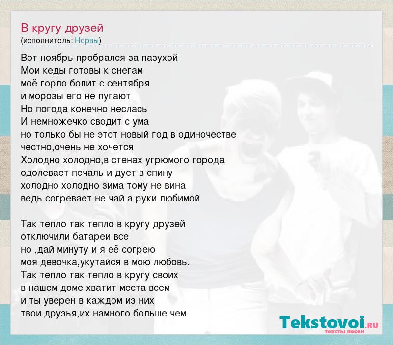 Вот ноябрь пробрался за пазухой Мои кеды готовы к снегам моё горло болит с сентября и морозы его не пугают Но погода конечно неслась И немножечко сводит с ума но только бы не этот новый год в одиночестве честно,очень не хочется Холодно холодно,в стенах угрюмого города одолевает печаль и дует в спину холодно холодно зима тому не вина ведь согревает не чай а руки любимой Так тепло так тепло в кругу друзей отключили батареи все но ,дай минуту и я её согрею моя девочка,укутайся в мою любовь. Так тепло так тепло в кругу своих в нашем доме хватит места всем и ты уверен в каждом из них твои друзья,их намного больше чем