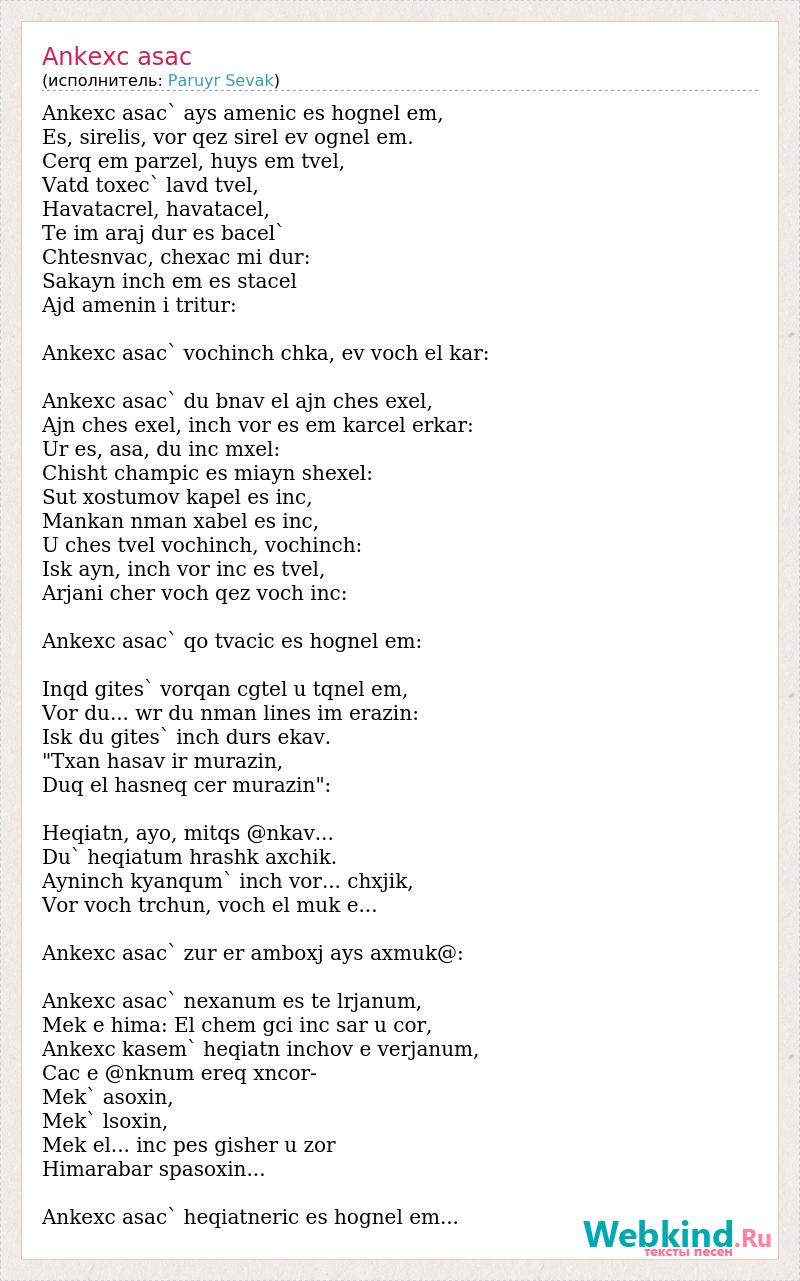 Ankexc asac` ays amenic es hognel em, Es, sirelis, vor qez sirel ev ognel em. Cerq em parzel, huys em tvel, Vatd toxec` lavd tvel, Havatacrel, havatacel, Te im araj dur es bacel` Chtesnvac, chexac mi dur: Sakayn inch em es stacel Ajd amenin i tritur: Ankexc asac` vochinch chka, ev voch el kar: Ankexc asac` du bnav el ajn ches exel, Ajn ches exel, inch vor es em karcel erkar: Ur es, asa, du inc mxel: Chisht champic es miayn shexel: Sut xostumov kapel es inc, Mankan nman xabel es inc, U ches tvel vochinch, vochinch: Isk ayn, inch vor inc es tvel, Arjani cher voch qez voch inc: Ankexc asac` qo tvacic es hognel em: Inqd gites` vorqan cgtel u tqnel em, Vor du... wr du nman lines im erazin: Isk du gites` inch durs ekav. "Txan hasav ir murazin, Duq el hasneq cer murazin": Heqiatn, ayo, mitqs @nkav... Du` heqiatum hrashk axchik. Ayninch kyanqum` inch vor... chxjik, Vor voch trchun, voch el muk e... Ankexc asac` zur er amboxj ays axmuk@: Ankexc asac` nexanum es te lrjanum, Mek e hima: El chem gci inc sar u cor, Ankexc kasem` heqiatn inchov e verjanum, Cac e @nknum ereq xncor- Mek` asoxin, Mek` lsoxin, Mek el... inc pes gisher u zor Himarabar spasoxin... Ankexc asac` heqiatneric es hognel em...