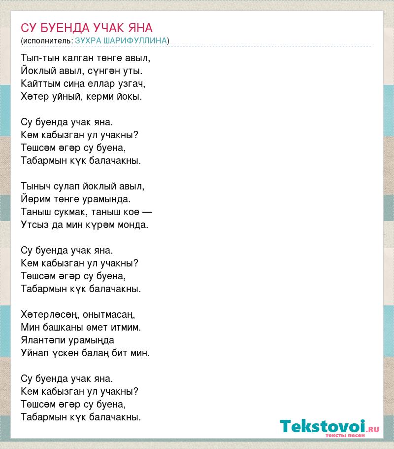 Тып-тын калган төнге авыл, Йоклый авыл, сүнгəн уты. Кайттым сиңа еллар узгач, Хəтер уйный, керми йокы. Су буенда учак яна. Кем кабызган ул учакны? Төшсəм əгəр су буена, Табармын күк балачакны. Тыныч сулап йоклый авыл, Йөрим төнге урамында. Таныш сукмак, таныш кое — Утсыз да мин күрəм монда. Су буенда учак яна. Кем кабызган ул учакны? Төшсəм əгəр су буена, Табармын күк балачакны. Хəтерлəсəң, онытмасаң, Мин башканы өмет итмим. Ялантəпи урамыңда Уйнап үскен балаң бит мин. Су буенда учак яна. Кем кабызган ул учакны? Төшсəм əгəр су буена, Табармын күк балачакны.