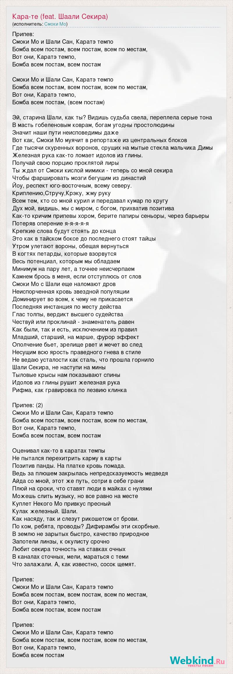 Припев: Смоки Мо и Шали Сан, Каратэ темпо Бомба всем постам, всем постам, всем по местам, Вот они, Каратэ темпо, Бомба всем постам, всем постам Смоки Мо и Шали Сан, Каратэ темпо Бомба всем постам, всем постам, всем по местам, Вот они, Каратэ темпо, Бомба всем постам, (всем постам) Эй, старина Шали, как ты? Видишь судьба свела, переплела серые тона В масть гобеленовым коврам, богам угодны простолюдины Значит наши пути неисповедимы даже Вот как, Смоки Мо муячит в репортаже из центральных блоков Где тысячи скуренных воронов, срущих на мытые стекла мальчика Димы Железная рука как-то ломает идолов из глины. Получай свою порцию проклятой лиры Ты ждал от Смоки кислой мимики - теперь со мной секира Чтобы фаршировать мозги бегущим из династий Йоу, респект юго-восточным, всему северу. Криплению,Стручу,Крэку, жму руку Всем тем, кто со мной курил и передавал кумар по кругу Дух мой, видишь, мы с миром, с богом, прихватив позитива Как-то кричим припевы хором, берите папиры сеньоры, через барьеры Потеряв оперение я-я-я-я-я Крепкие слова будут стоять до конца Это как в тайском боксе до последнего стоят тайцы Утром улетают вороны, обещая вернуться В когтях петарды, которые взорвутся Весь потенциал, которым мы обладаем Минимум на пару лет, а точнее неисчерпаем Камнем брось в меня, если отступлюсь от слов Смоки Мо с Шали еще наломают дров Неиспорченная кровь звездной популяции Доминирует во всем, к чему не прикасается Последняя инстанция по месту действа Глас толпы, вердикт высшего судейства Чествуй или проклинай - знаменатель равен Как были, так и есть, исключением из правил Младший, старший, на марше, фурор эффект Ополчение бьет, зрелище рвет и мечет во след Несущим всю ярость праведного гнева в стиле Не ведаю усталости как сталь, что прошла горнило Шали Секира, не наступи на мины Тыловые крысы нам показывают спины Идолов из глины рушит железная рука Рифма, как гравировка по лезвию клинка Припев: (2) Смоки Мо и Шали Сан, Каратэ темпо Бомба всем постам, всем постам, всем по местам, Вот они, Каратэ темпо, Бомба всем постам, всем постам Оценивал как-то в каратах темпы Не пытался перехитрить карму в карты Позитив панды. На платке кровь помада. Ведь за плюшем закрылась непредсказуемость медведя Айда со мной, этот же путь, сотри в себе грани Плюй на сроки, что ставят люди в майках с нулями Можешь слить музыку, но все равно на месте Куплет Некого Мо привкус пресный Кулак железный. Шали. Как насяду, так и слезут рикошетом от брови. По ком, ребята, проводы? Дифирамбы эти скорбные. В землю не зарытых быстро, качество природное Запотели линзы, к окулисту срочно Любит секира точность на ставках очных В каналах сточных, мели, мараться с теми Что залажали. А, как известно, сосок щемят. Припев: Смоки Мо и Шали Сан, Каратэ темпо Бомба всем постам, всем постам, всем по местам, Вот они, Каратэ темпо, Бомба всем постам, всем постам Припев: Смоки Мо и Шали Сан, Каратэ темпо Бомба всем постам, всем постам, всем по местам, Вот они, Каратэ темпо, Бомба всем постам