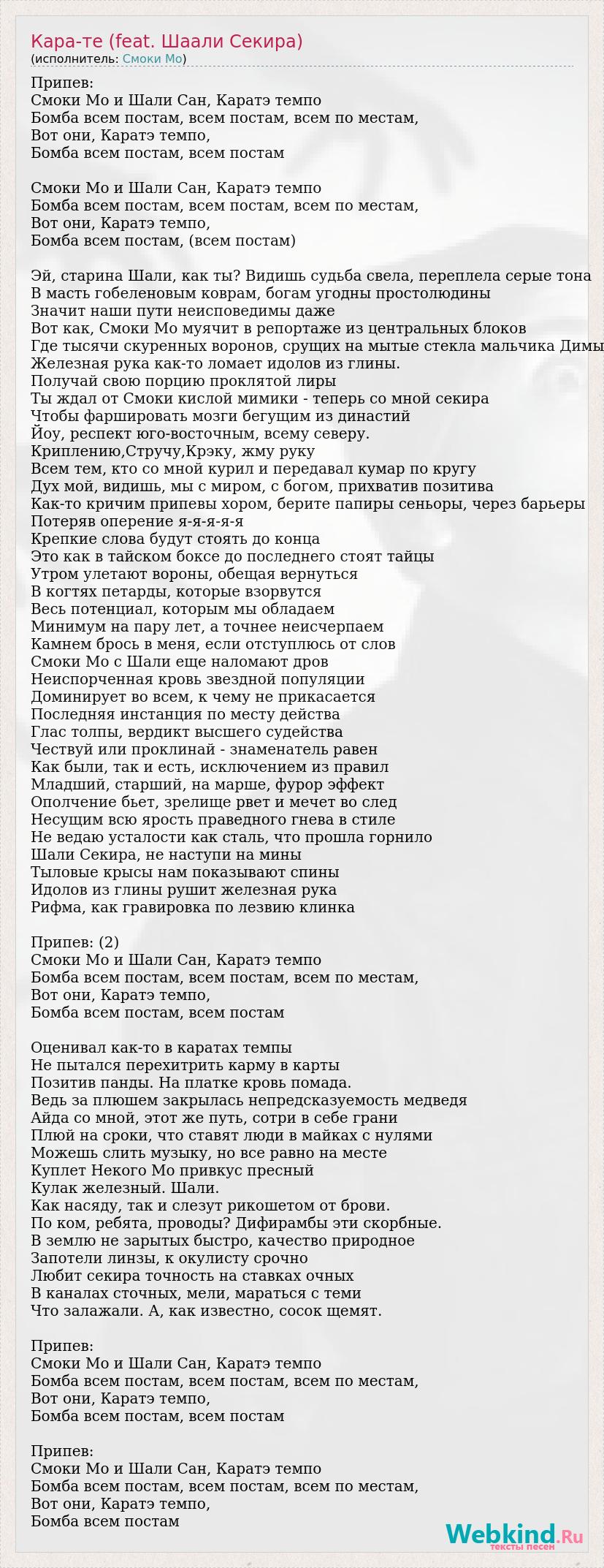 Припев: Смоки Мо и Шали Сан, Каратэ темпо Бомба всем постам, всем постам, всем по местам, Вот они, Каратэ темпо, Бомба всем постам, всем постам Смоки Мо и Шали Сан, Каратэ темпо Бомба всем постам, всем постам, всем по местам, Вот они, Каратэ темпо, Бомба всем постам, (всем постам) Эй, старина Шали, как ты? Видишь судьба свела, переплела серые тона В масть гобеленовым коврам, богам угодны простолюдины Значит наши пути неисповедимы даже Вот как, Смоки Мо муячит в репортаже из центральных блоков Где тысячи скуренных воронов, срущих на мытые стекла мальчика Димы Железная рука как-то ломает идолов из глины. Получай свою порцию проклятой лиры Ты ждал от Смоки кислой мимики - теперь со мной секира Чтобы фаршировать мозги бегущим из династий Йоу, респект юго-восточным, всему северу. Криплению,Стручу,Крэку, жму руку Всем тем, кто со мной курил и передавал кумар по кругу Дух мой, видишь, мы с миром, с богом, прихватив позитива Как-то кричим припевы хором, берите папиры сеньоры, через барьеры Потеряв оперение я-я-я-я-я Крепкие слова будут стоять до конца Это как в тайском боксе до последнего стоят тайцы Утром улетают вороны, обещая вернуться В когтях петарды, которые взорвутся Весь потенциал, которым мы обладаем Минимум на пару лет, а точнее неисчерпаем Камнем брось в меня, если отступлюсь от слов Смоки Мо с Шали еще наломают дров Неиспорченная кровь звездной популяции Доминирует во всем, к чему не прикасается Последняя инстанция по месту действа Глас толпы, вердикт высшего судейства Чествуй или проклинай - знаменатель равен Как были, так и есть, исключением из правил Младший, старший, на марше, фурор эффект Ополчение бьет, зрелище рвет и мечет во след Несущим всю ярость праведного гнева в стиле Не ведаю усталости как сталь, что прошла горнило Шали Секира, не наступи на мины Тыловые крысы нам показывают спины Идолов из глины рушит железная рука Рифма, как гравировка по лезвию клинка Припев: (2) Смоки Мо и Шали Сан, Каратэ темпо Бомба всем постам, всем постам, всем по местам, Вот они, Каратэ темпо, Бомба всем постам, всем постам Оценивал как-то в каратах темпы Не пытался перехитрить карму в карты Позитив панды. На платке кровь помада. Ведь за плюшем закрылась непредсказуемость медведя Айда со мной, этот же путь, сотри в себе грани Плюй на сроки, что ставят люди в майках с нулями Можешь слить музыку, но все равно на месте Куплет Некого Мо привкус пресный Кулак железный. Шали. Как насяду, так и слезут рикошетом от брови. По ком, ребята, проводы? Дифирамбы эти скорбные. В землю не зарытых быстро, качество природное Запотели линзы, к окулисту срочно Любит секира точность на ставках очных В каналах сточных, мели, мараться с теми Что залажали. А, как известно, сосок щемят. Припев: Смоки Мо и Шали Сан, Каратэ темпо Бомба всем постам, всем постам, всем по местам, Вот они, Каратэ темпо, Бомба всем постам, всем постам Припев: Смоки Мо и Шали Сан, Каратэ темпо Бомба всем постам, всем постам, всем по местам, Вот они, Каратэ темпо, Бомба всем постам
