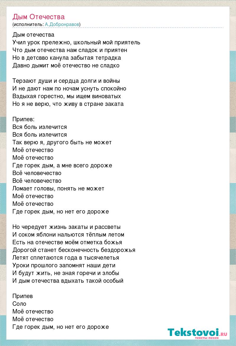 Дым отечества Учил урок прележно, школьный мой приятель Что дым отечества нам сладок и приятен Но в детсвво канула забытая тетрадка Давно дымит моё отечество не сладко Терзают души и сердца долги и войны И не дают нам по ночам уснуть спокойно Вздыхая горестно, мы ищем виноватых Но я не верю, что живу в стране заката Припев: Вся боль излечится Вся боль излечится Так верю я, другого быть не может Моё отечество Моё отечество Где горек дым, а мне всего дороже Всё человечество Всё человечество Ломает головы, понять не может Моё отечество Моё отечество Где горек дым, но нет его дороже Но чередует жизнь закаты и рассветы И соком яблони нальются тёплым летом Есть на отечестве моём отметка божья Дорогой станет бесконечность бездорожья Летят сплетаются года в тысячелетья Уроки прошлого запомнят наши дети И будут жить, не зная горечи и злобы И дым отечества вдыхать такой особый Припев Соло Моё отечество Моё отечество Где горек дым, но нет его дороже