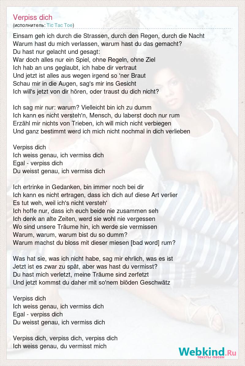 Einsam geh ich durch die Strassen, durch den Regen, durch die Nacht Warum hast du mich verlassen, warum hast du das gemacht? Du hast nur gelacht und gesagt: War doch alles nur ein Spiel, ohne Regeln, ohne Ziel Ich hab an uns geglaubt, ich habe dir vertraut Und jetzt ist alles aus wegen irgend so 'ner Braut Schau mir in die Augen, sag's mir ins Gesicht Ich will's jetzt von dir hören, oder traust du dich nicht? Ich sag mir nur: warum? Vielleicht bin ich zu dumm Ich kann es nicht versteh'n, Mensch, du laberst doch nur rum Erzähl mir nichts von Trieben, ich will mich nicht verbiegen Und ganz bestimmt werd ich mich nicht nochmal in dich verlieben Verpiss dich Ich weiss genau, ich vermiss dich Egal - verpiss dich Du weisst genau, ich vermiss dich Ich ertrinke in Gedanken, bin immer noch bei dir Ich kann es nicht ertragen, dass ich dich auf diese Art verlier Es tut weh, weil ich's nicht versteh' Ich hoffe nur, dass ich euch beide nie zusammen seh Ich denk an alte Zeiten, werd sie wohl nie vergessen Wo sind unsere Träume hin, ich werde sie vermissen Warum, warum, warum bist du so dumm? Warum machst du bloss mit dieser miesen [bad word] rum? Was hat sie, was ich nicht habe, sag mir ehrlich, was es ist Jetzt ist es zwar zu spät, aber was hast du vermisst? Du hast mich verletzt, meine Träume sind zerfetzt Und jetzt kommst du daher mit so'nem blöden Geschwätz Verpiss dich Ich weiss genau, ich vermiss dich Egal - verpiss dich Du weisst genau, ich vermiss dich Verpiss dich, verpiss dich, verpiss dich Ich weiss genau, du vermisst mich