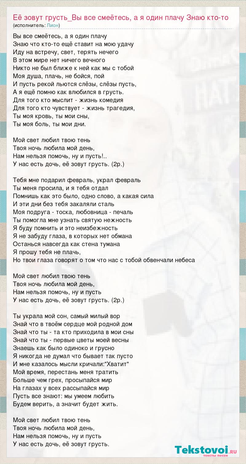 Вы все смеётесь, а я один плачу Знаю что кто-то ещё ставит на мою удачу Иду на встречу, свет, терять нечего В этом мире нет ничего вечного Никто не был ближе к ней как мы с тобой Моя душа, плачь, не бойся, пой И пусть рекой льются слёзы, слёзы пусть, А я ещё помню как влюбился в грусть. Для того кто мыслит - жизнь комедия Для того кто чувствует - жизнь трагедия, Ты моя кровь, ты мои сны, Ты моя боль, ты мои дни. Мой свет любил твою тень Твоя ночь любила мой день, Нам нельзя помочь, ну и пусть!.. У нас есть дочь, её зовут грусть. (2р.) Тебя мне подарил февраль, украл февраль Ты меня просила, и я тебя отдал Помнишь как это было, одно слово, а какая сила И эти дни без тебя закаляли сталь Моя подруга - тоска, любовница - печаль Ты помогла мне узнать святую нежность Я буду помнить и это неизбежность Я не забуду глаза, в которых нет обмана Останься навсегда как стена тумана Я прошу тебя не плачь, Но твои глаза говорят о том что нас с тобой обвенчали небеса Мой свет любил твою тень Твоя ночь любила мой день, Нам нельзя помочь, ну и пусть У нас есть дочь, её зовут грусть. (2р.) Ты украла мой сон, самый милый вор Знай что в твоём сердце мой родной дом Знай что ты - та кто приходила в мои сны Знай что ты - первые цветы моей весны Знаешь как было одиноко и грусно Я никогда не думал что бывает так пусто И мне казалось мысли кричали:"Хватит" Мой время, перестань меня тратить Больше чем грех, просыпайся мир На глазах у всех рассыпайся мир Пусть все знают: мы умеем любить Будем верить, а значит будет жить. Мой свет любил твою тень Твоя ночь любила мой день, Нам нельзя помочь, ну и пусть У нас есть дочь, её зовут грусть.
