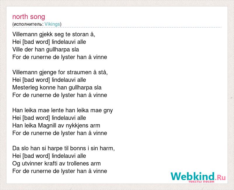 Villemann gjekk seg te storan å, Hei [bad word] lindelauvi alle Ville der han gullharpa sla For de runerne de lyster han å vinne Villemann gjenge for straumen å stå, Hei [bad word] lindelauvi alle Mesterleg konne han gullharpa sla For de runerne de lyster han å vinne Han leika mae lente han leika mae gny Hei [bad word] lindelauvi alle Han leika Magnill av nykkjens arm For de runerne de lyster han å vinne Da slo han si harpe til bonns i sin harm, Hei [bad word] lindelauvi alle Og utvinner krafti av trollenes arm For de runerne de lyster han å vinne