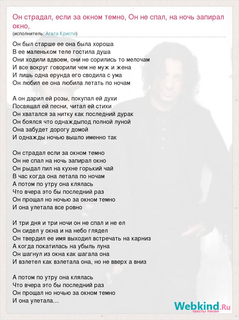 Он был старше ее она была хороша В ее маленьком теле гостила душа Они ходили вдвоем, они не сорились то мелочам И все вокруг говорили чем не муж и жена И лишь одна ерунда его сводила с ума Он любил ее она любила летать по ночам А он дарил ей розы, покупал ей духи Посвящал ей песни, читал ей стихи Он хватался за нитку как последний дурак Он боялся что однаждыпод полной луной Она забудет дорогу домой И однажды ночью вышло именно так Он страдал если за окном темно Он не спал на ночь запирал окно Он рыдал пил на кухне горький чай В час когда она летала по ночам А потом по утру она клялась Что вчера это бы последний раз Он прощал но ночью за окном темно И она улетала все ровно И три дня и три ночи он не спал и не ел Он сидел у окна и на небо глядел Он твердил ее имя выходил встречать на карниз А когда покатилась на убыль луна Он шагнул из окна как шагала она И взлетел как взлетала она, но не вверх а вниз А потом по утру она клялась Что вчера это бы последний раз Он прощал но ночью за окном темно И она улетала…