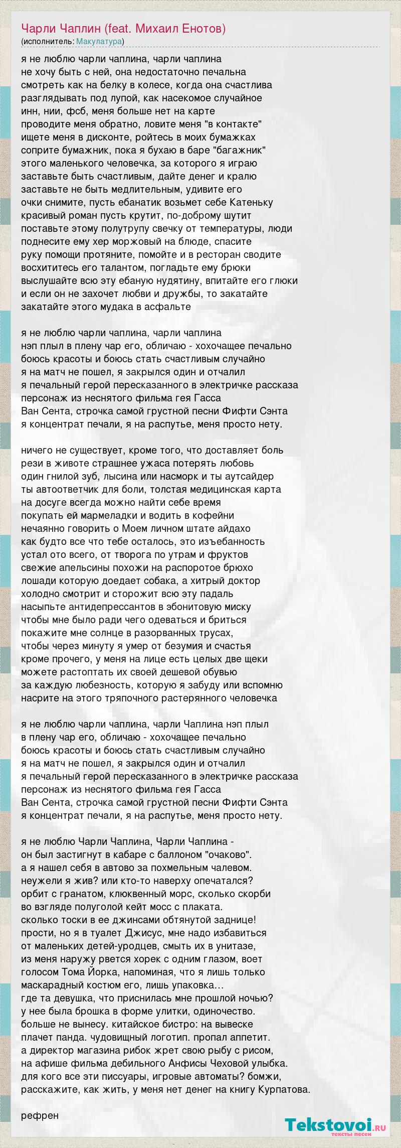 я не люблю чарли чаплина, чарли чаплина не хочу быть с ней, она недостаточно печальна смотреть как на белку в колесе, когда она счастлива разглядывать под лупой, как насекомое случайное инн, нии, фсб, меня больше нет на карте проводите меня обратно, ловите меня "в контакте" ищете меня в дисконте, ройтесь в моих бумажках соприте бумажник, пока я бухаю в баре "багажник" этого маленького человечка, за которого я играю заставьте быть счастливым, дайте денег и кралю заставьте не быть медлительным, удивите его очки снимите, пусть ебанатик возьмет себе Катеньку красивый роман пусть крутит, по-доброму шутит поставьте этому полутрупу свечку от температуры, люди поднесите ему хер моржовый на блюде, спасите руку помощи протяните, помойте и в ресторан сводите восхититесь его талантом, погладьте ему брюки выслушайте всю эту ебаную нудятину, впитайте его глюки и если он не захочет любви и дружбы, то закатайте закатайте этого мудака в асфальте я не люблю чарли чаплина, чарли чаплина нэп плыл в плену чар его, обличаю - хохочащее печально боюсь красоты и боюсь стать счастливым случайно я на матч не пошел, я закрылся один и отчалил я печальный герой пересказанного в электричке рассказа персонаж из неснятого фильма гея Гасса Ван Сента, строчка самой грустной песни Фифти Сэнта я концентрат печали, я на распутье, меня просто нету. ничего не существует, кроме того, что доставляет боль рези в животе страшнее ужаса потерять любовь один гнилой зуб, лысина или насморк и ты аутсайдер ты автоответчик для боли, толстая медицинская карта на досуге всегда можно найти себе время покупать ей мармеладки и водить в кофейни нечаянно говорить о Моем личном штате айдахо как будто все что тебе осталось, это изъебанность устал ото всего, от творога по утрам и фруктов свежие апельсины похожи на распоротое брюхо лошади которую доедает собака, а хитрый доктор холодно смотрит и сторожит всю эту падаль насыпьте антидепрессантов в эбонитовую миску чтобы мне было ради чего одеваться и бриться покажите мне солнце в разорванных трусах, чтобы через минуту я умер от безумия и счастья кроме прочего, у меня на лице есть целых две щеки можете растоптать их своей дешевой обувью за каждую любезность, которую я забуду или вспомню насрите на этого тряпочного растерянного человечка я не люблю чарли чаплина, чарли Чаплина нэп плыл в плену чар его, обличаю - хохочащее печально боюсь красоты и боюсь стать счастливым случайно я на матч не пошел, я закрылся один и отчалил я печальный герой пересказанного в электричке рассказа персонаж из неснятого фильма гея Гасса Ван Сента, строчка самой грустной песни Фифти Сэнта я концентрат печали, я на распутье, меня просто нету. я не люблю Чарли Чаплина, Чарли Чаплина - он был застигнут в кабаре с баллоном "очаково". а я нашел себя в автово за похмельным чалевом. неужели я жив? или кто-то наверху опечатался? орбит с гранатом, клюквенный морс, сколько скорби во взгляде полуголой кейт мосс с плаката. сколько тоски в ее джинсами обтянутой заднице! прости, но я в туалет Джисус, мне надо избавиться от маленьких детей-уродцев, смыть их в унитазе, из меня наружу рвется хорек с одним глазом, воет голосом Тома Йорка, напоминая, что я лишь только маскарадный костюм его, лишь упаковка… где та девушка, что приснилась мне прошлой ночью? у нее была брошка в форме улитки, одиноче