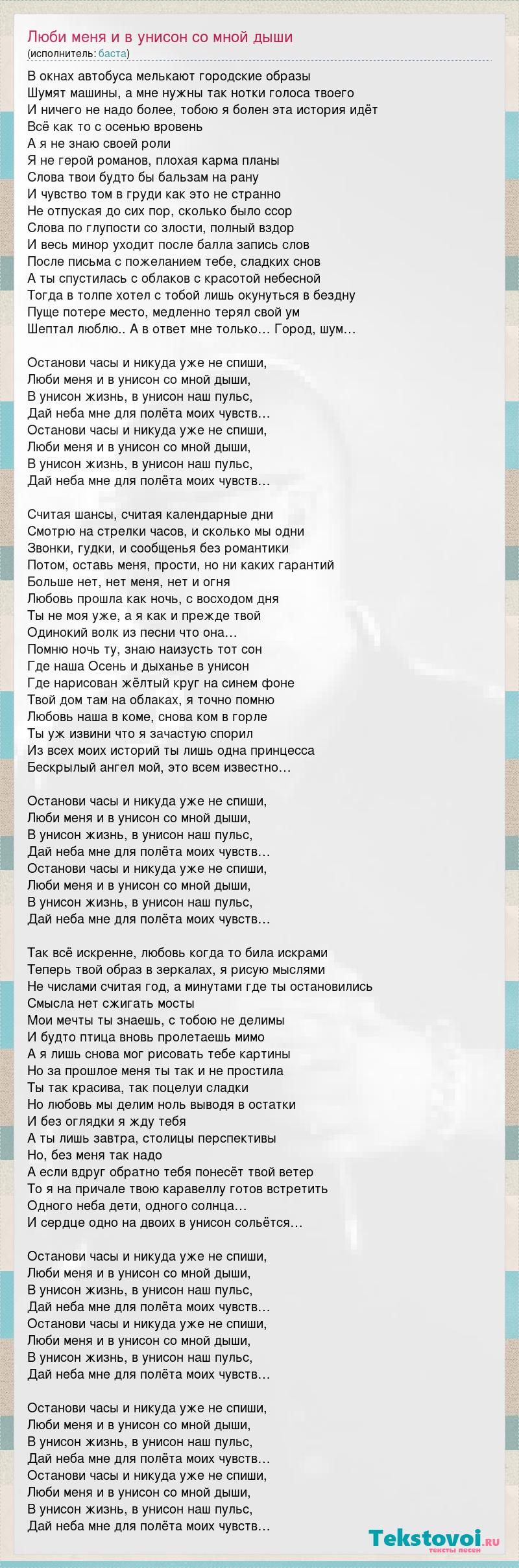 В окнах автобуса мелькают городские образы Шумят машины, а мне нужны так нотки голоса твоего И ничего не надо более, тобою я болен эта история идёт Всё как то с осенью вровень А я не знаю своей роли Я не герой романов, плохая карма планы Слова твои будто бы бальзам на рану И чувство том в груди как это не странно Не отпуская до сих пор, сколько было ссор Слова по глупости со злости, полный вздор И весь минор уходит после балла запись слов После письма с пожеланием тебе, сладких снов А ты спустилась с облаков с красотой небесной Тогда в толпе хотел с тобой лишь окунуться в бездну Пуще потере место, медленно терял свой ум Шептал люблю.. А в ответ мне только… Город, шум… Останови часы и никуда уже не спиши, Люби меня и в унисон со мной дыши, В унисон жизнь, в унисон наш пульс, Дай неба мне для полёта моих чувств… Останови часы и никуда уже не спиши, Люби меня и в унисон со мной дыши, В унисон жизнь, в унисон наш пульс, Дай неба мне для полёта моих чувств… Считая шансы, считая календарные дни Смотрю на стрелки часов, и сколько мы одни Звонки, гудки, и сообщенья без романтики Потом, оставь меня, прости, но ни каких гарантий Больше нет, нет меня, нет и огня Любовь прошла как ночь, с восходом дня Ты не моя уже, а я как и прежде твой Одинокий волк из песни что она… Помню ночь ту, знаю наизусть тот сон Где наша Осень и дыханье в унисон Где нарисован жёлтый круг на синем фоне Твой дом там на облаках, я точно помню Любовь наша в коме, снова ком в горле Ты уж извини что я зачастую спорил Из всех моих историй ты лишь одна принцесса Бескрылый ангел мой, это всем известно… Останови часы и никуда уже не спиши, Люби меня и в унисон со мной дыши, В унисон жизнь, в унисон наш пульс, Дай неба мне для полёта моих чувств… Останови часы и никуда уже не спиши, Люби меня и в унисон со мной дыши, В унисон жизнь, в унисон наш пульс, Дай неба мне для полёта моих чувств… Так всё искренне, любовь когда то била искрами Теперь твой образ в зеркалах, я рисую мыслями Не числами считая год, а минутами где ты остановились Смысла нет сжигать мосты Мои мечты ты знаешь, с тобою не делимы И будто птица вновь пролетаешь мимо А я лишь снова мог рисовать тебе картины Но за прошлое меня ты так и не простила Ты так красива, так поцелуи сладки Но любовь мы делим ноль выводя в остатки И без оглядки я жду тебя А ты лишь завтра, столицы перспективы Но, без меня так надо А если вдруг обратно тебя понесёт твой ветер То я на причале твою каравеллу готов встретить Одного неба дети, одного солнца… И сердце одно на двоих в унисон сольётся… Останови часы и никуда уже не спиши, Люби меня и в унисон со мной дыши, В унисон жизнь, в унисон наш пульс, Дай неба мне для полёта моих чувств… Останови часы и никуда уже не спиши, Люби меня и в унисон со мной дыши, В унисон жизнь, в унисон наш пульс, Дай неба мне для полёта моих чувств… Останови часы и никуда уже не спиши, Люби меня и в унисон со мной дыши, В унисон жизнь, в унисон наш пульс, Дай неба мне для полёта моих чувств… Останови часы и никуда уже не спиши, Люби меня и в унисон со мной дыши, В унисон жизнь, в унисон наш пульс, Дай неба мне для полёта моих чувств…